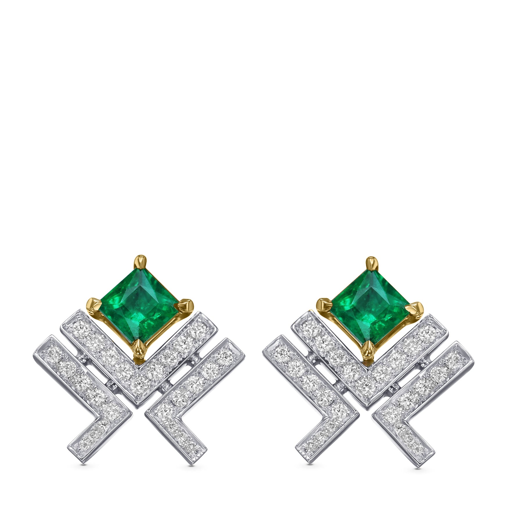 A stylish pair of green emerald and pave diamond stud earrings, with princess green emeralds and collection color brilliants styled in a channel set, closed pave Leibish logo design and mounted in 18K white and yellow gold.