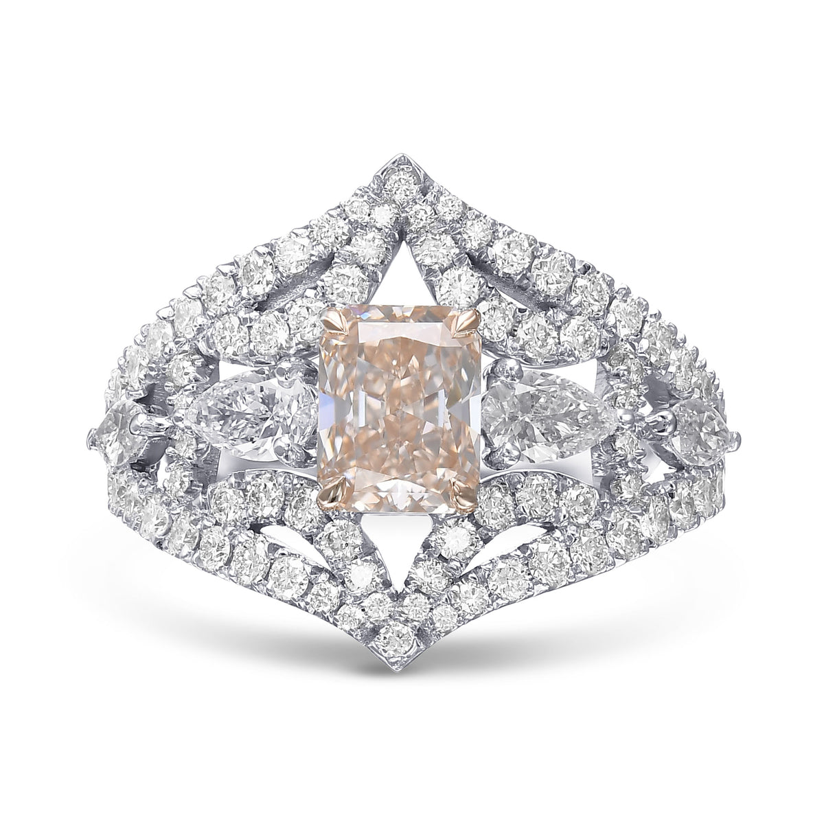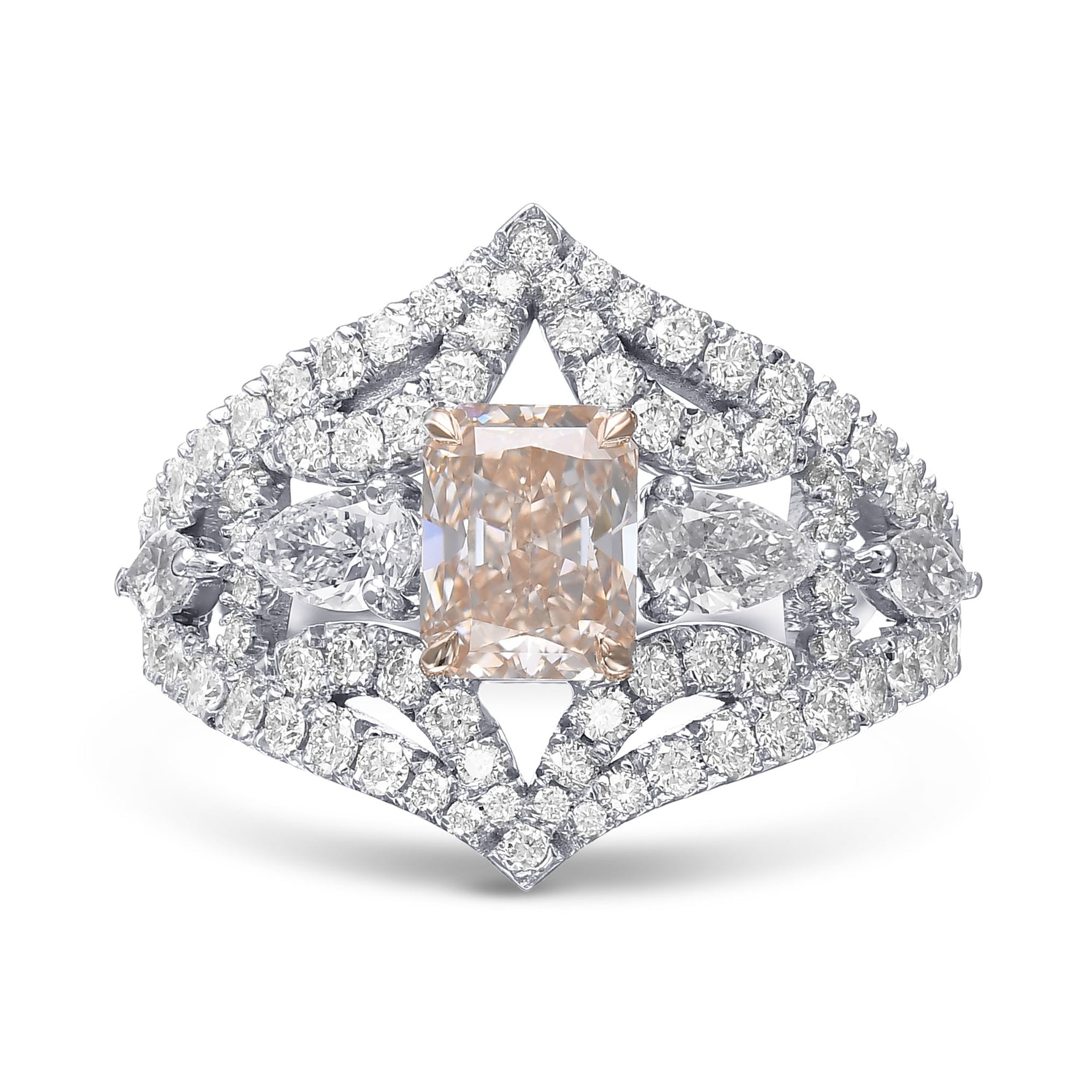 A stunning side-stone ring, featuring a 1.04 carat fancy light pink brown radiant, colorless pears, marquises, and round brilliant diamonds. The center stone is certified by GIA. Mounted in 18K white and rose gold.