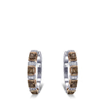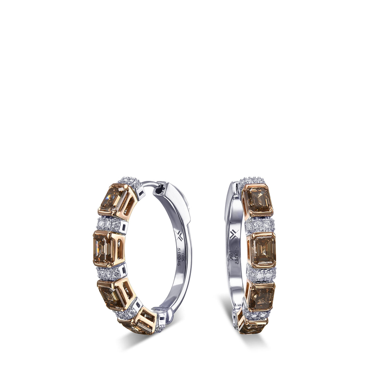 A fabulous pair of fancy brown diamond hoop earrings with 4.62cts emerald shape diamonds styled in a semi bezel setting and accented by collection color brilliants side stones. The earrings are mounted in 18K white and rose gold.