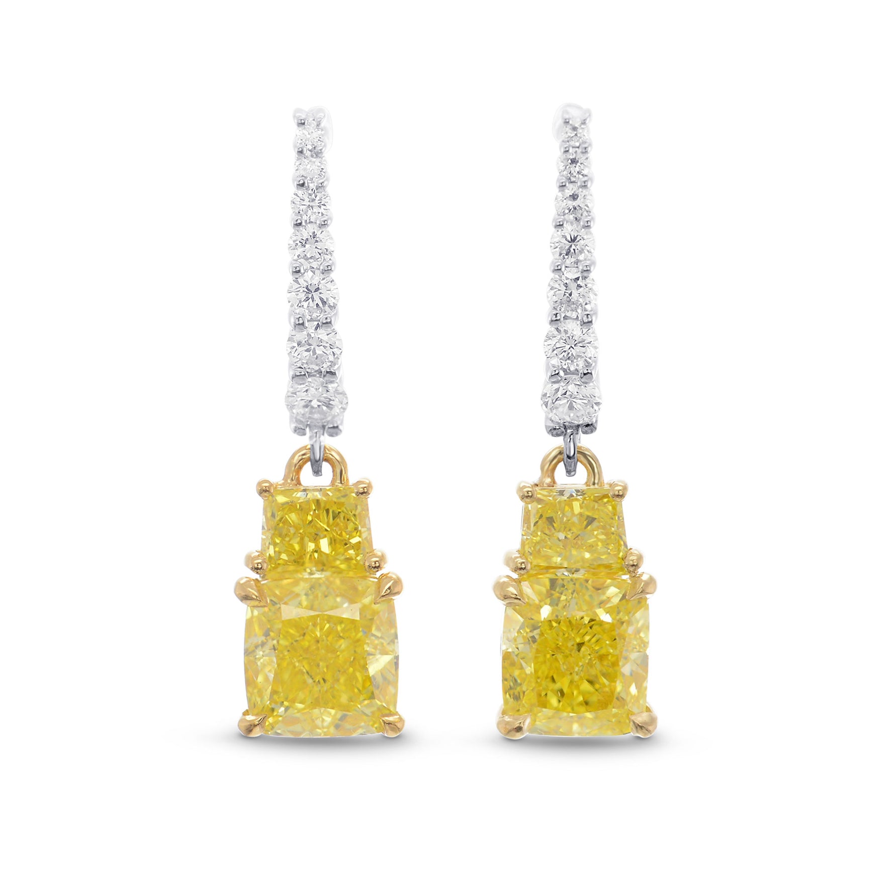 An elegant pair of Fancy Intense Yellow Cushion and Vivid Yellow Taper Diamond Drop Earrings, total weight 2.56cts.� The diamonds are set with the tapers above the Cushion,� one above the other, and styled in a Claw setting. The post is accented with 14 F+ color brilliants styled in a prong setting, and the earrings are mounted in 18K White and Yellow Gold.