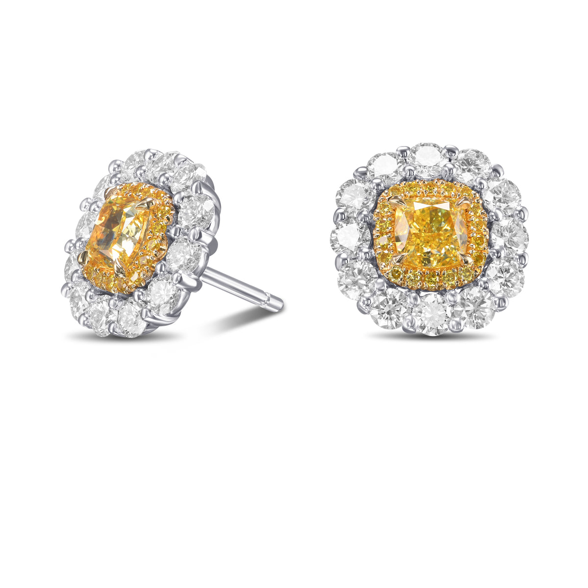 The perfect gift...a fancy intense yellow and white diamond flower motif stud halo earring mounted in 18K white and yellow gold. The center diamonds are a pair of fancy intense yellow cushions weighing 1.15cts. The side diamonds are collection color and fancy vivid yellow brilliants styled in a two-color double halo. These earrings are part of the Rosie Bloom collection.