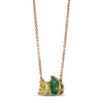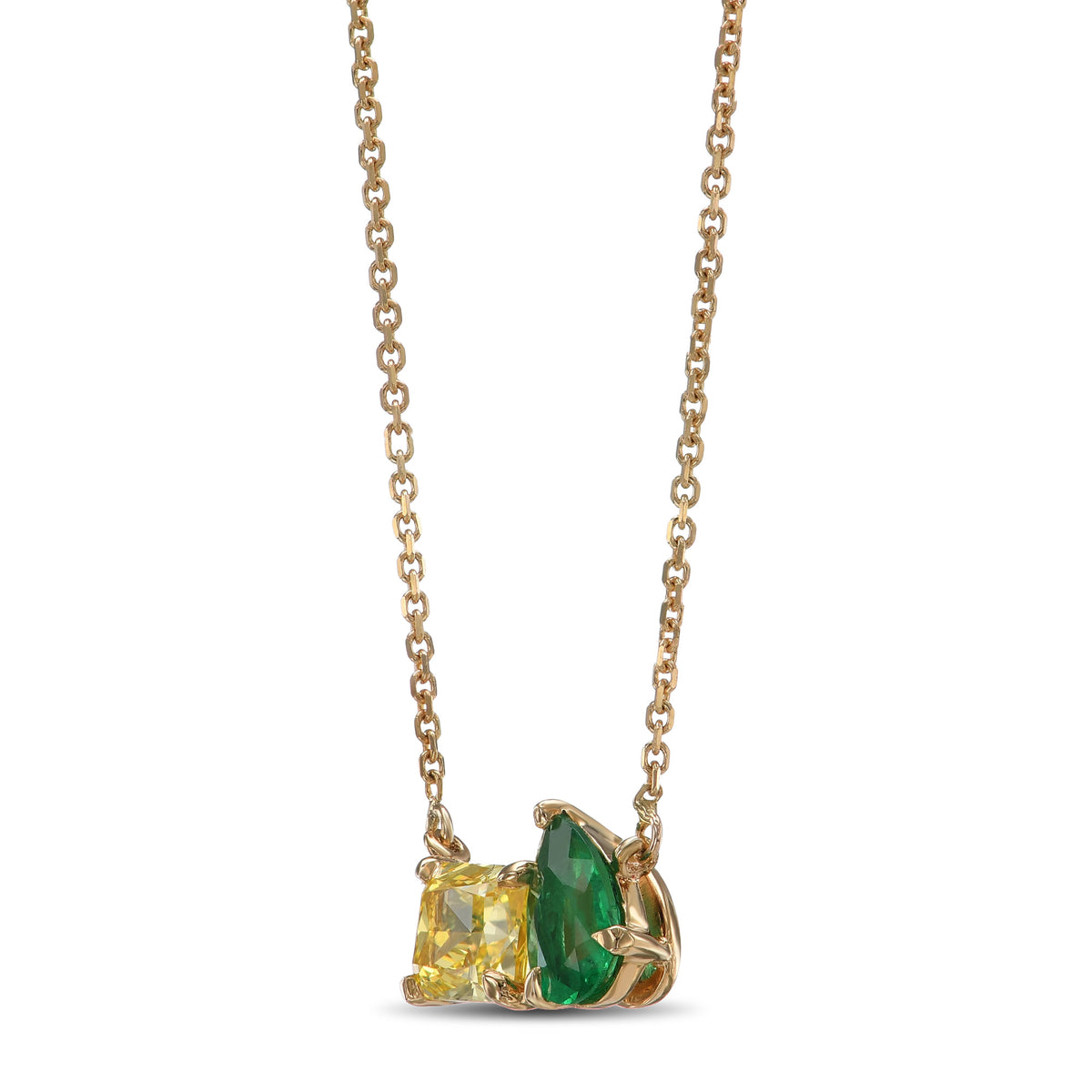 A lovely 2 stone emerald and fancy vivid yellow diamond pendant, with a pear shape emerald gemstone weighing 0.28cts and a fancy vivid yellow radiant shape diamond weighing 0.51cts. and certified by GIA. The stones are styled in prongs and mounted in 18K yellow gold.