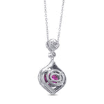 A spectacular oval ruby and diamond pendant mounted in 18K white and yellow gold. The ruby is certified by TIGL and weighs 2.16Ct. The side diamonds are collection color white brilliants weighing 0.59Ct TW. The pendant is styled with a ruby set horizontally in a floating bezel setting, surrounded by a pave halo, that hangs freely from a pave bail.