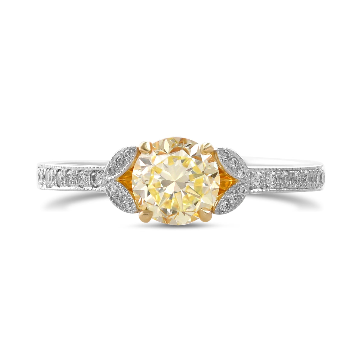 This elegant engagement ring features a 0.94ct fancy yellow round diamond with VVS2 clarity, certified by GIA. Set in a blend of 18K white and yellow gold, it showcases intricate milgrain pave leaf designs along the shank. Part of the Soleil collection, this ring beautifully combines brilliance and delicate craftsmanship, perfect for a timeless expression of love.