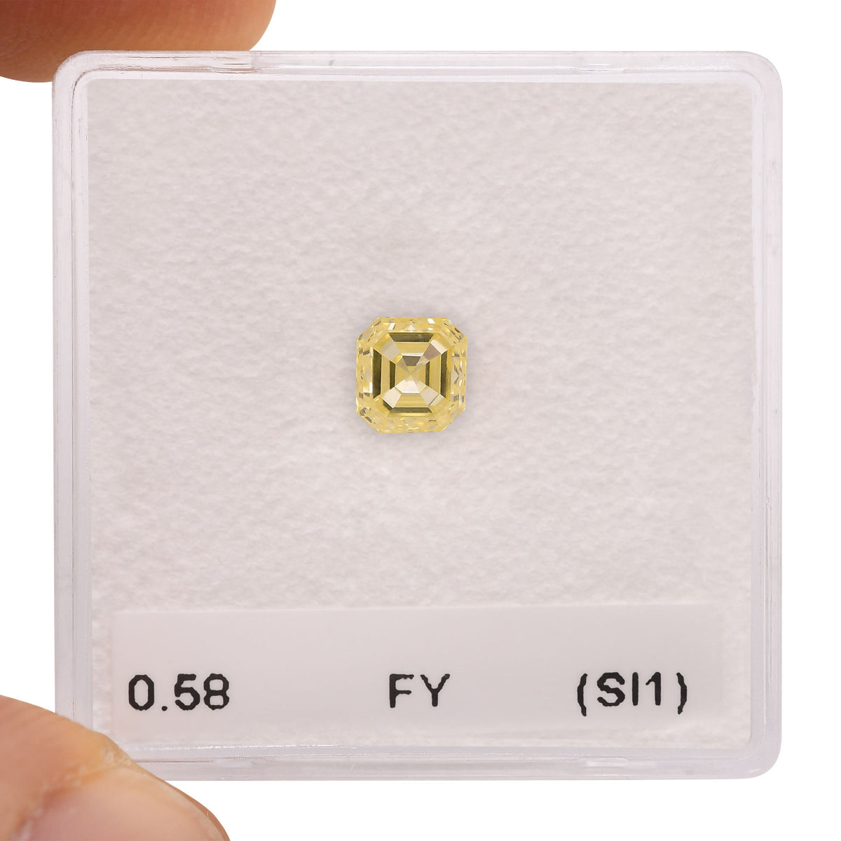 0.58 carat, Fancy Yellow, Asscher shape Diamond with SI1 clarity. A wonderful Yellow Diamond with a lively Lemon color face up. Color and clarity graded by our in house GIA GG Graduate Gemologist.