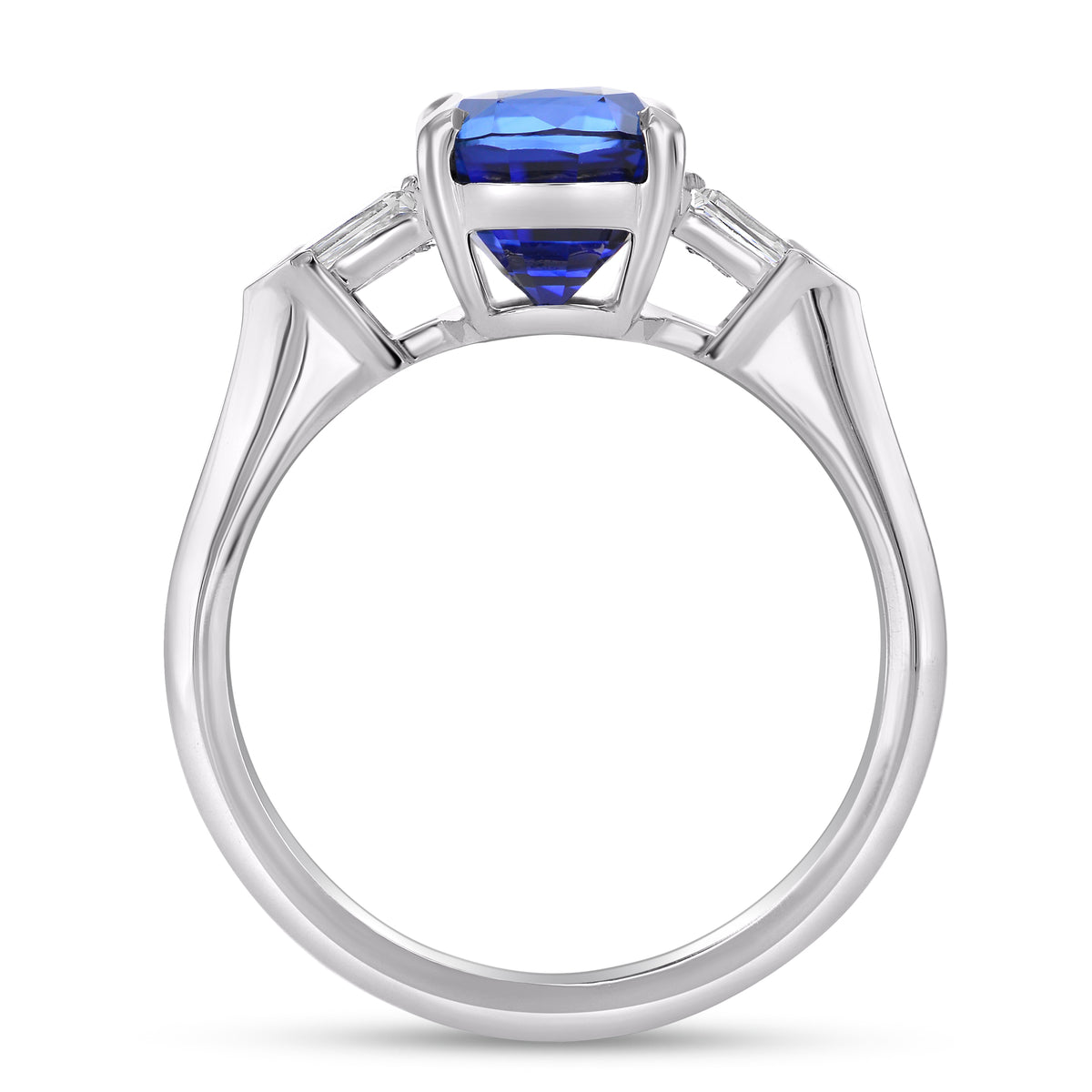 A spectacular sapphire and diamond engagement ring, featuring a royal blue cushion shape sapphire center stone, weighing 3.48 cts. and certified by GRS. The sapphire is flanked by 2 collection color shield diamonds, and the ring is mounted in all platinum.
