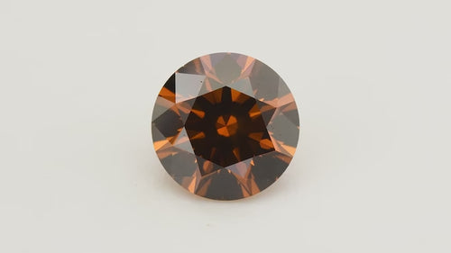 A striking 0.85 carat Fancy Deep Brownish Orange round diamond, GIA certified with I1 clarity. This is a Hearts and Arrows Diamond, a meticulously cut round brilliant diamond, known for its "super-ideal" precision, where perfect optical symmetry reveals eight distinct hearts when viewed from the bottom (pavilion) and eight symmetrical arrows when seen from the top (crown). This rare colored stone combines distinctive warmth with brilliant sparkle, perfect for the discerning collector seeking something truly exceptional and authentic.