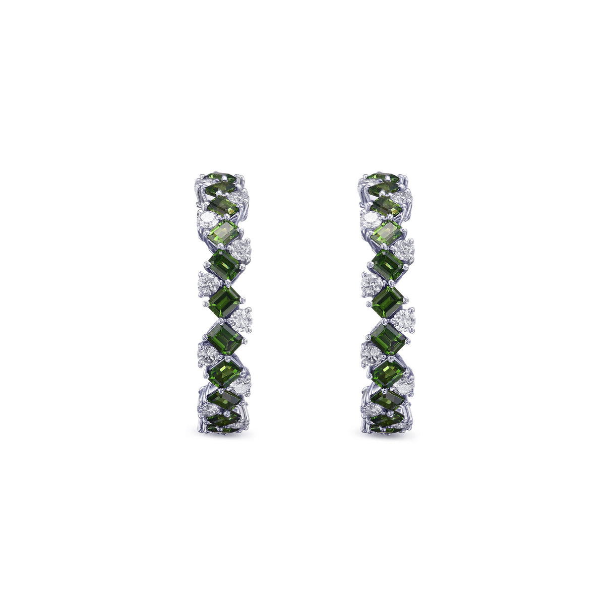 A stylish pair of green tourmaline and diamond earrings, with emerald shape tourmalines and white diamond brilliants styled in an alternating zigzag motif, and mounted in 18K white gold. The earrings have the option to be purchased as part of a matching set of ring and pendant.