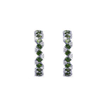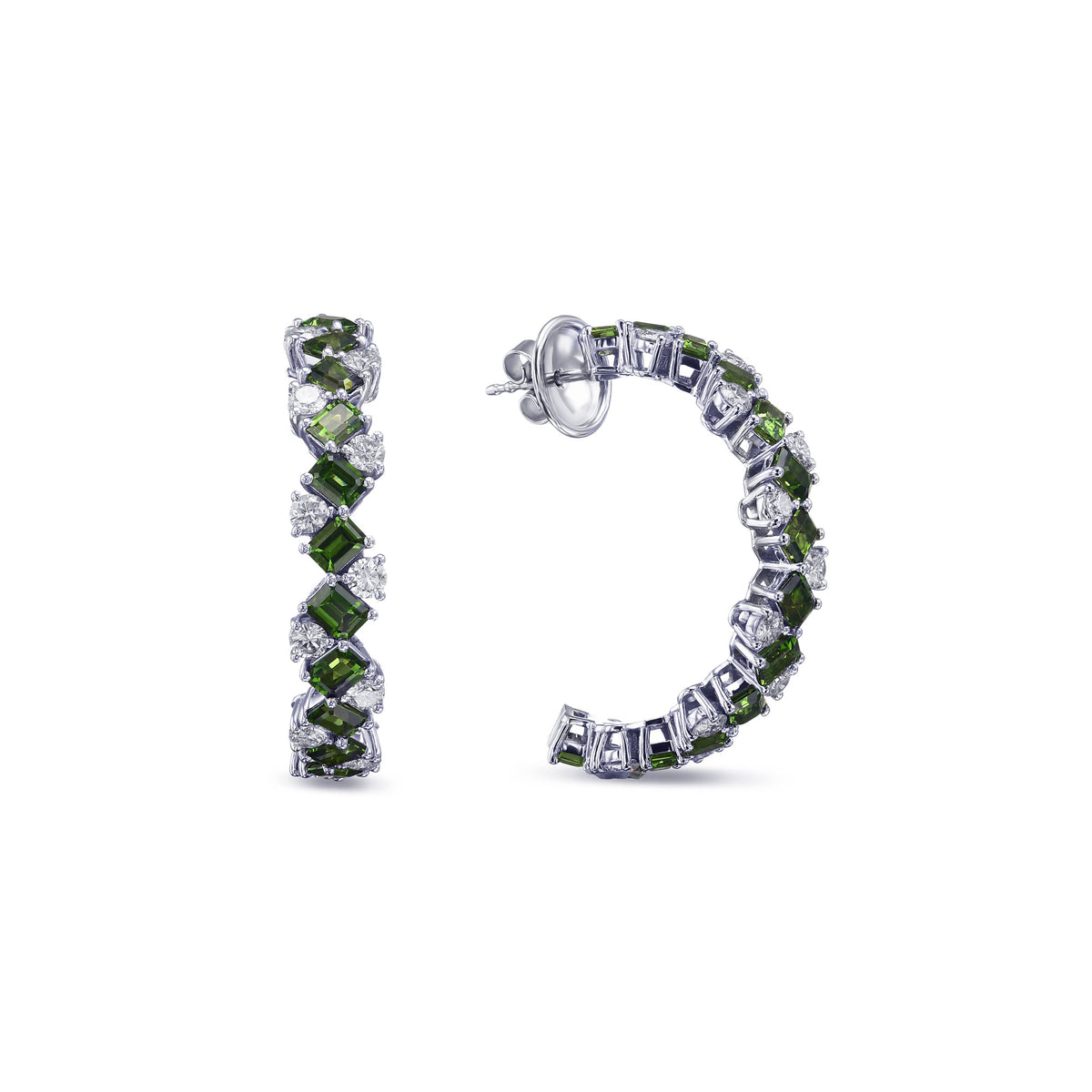Prezzo unitario / perA stylish pair of green tourmaline and diamond earrings, with emerald shape tourmalines and white diamond brilliants styled in an alternating zigzag motif, and mounted in 18K white gold. The earrings have the option to be purchased as part of a matching set of ring and pendant.