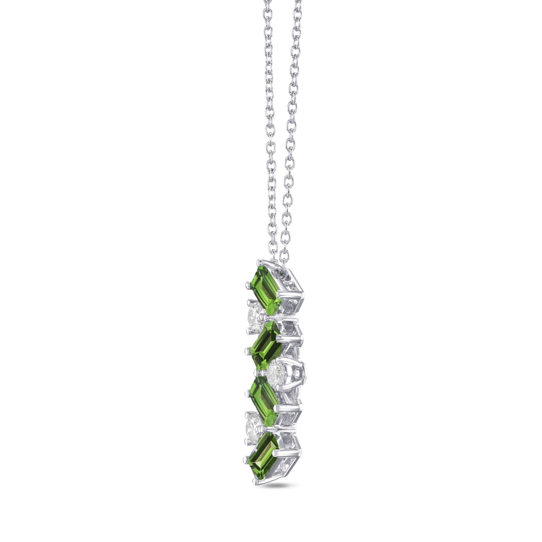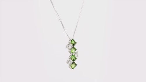 This elegant green tourmaline and diamond drop pendant features 0.77cts of emerald-cut tourmalines and 0.28cts of white diamond brilliants arranged in a striking zigzag pattern. Crafted in 18K white gold, it offers timeless sophistication and can be paired with matching earrings and a ring for a complete, captivating look.