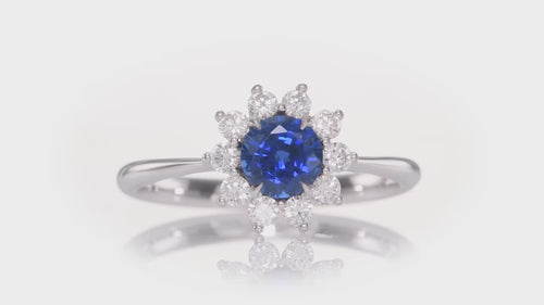 Prezzo unitario / perA beautiful round blue sapphire and diamond halo ring, with a center gemstone weighing 0.76cts. The ring features collection color brilliants styled with prongs in a floral motif halo, and mounted in 18K white gold.