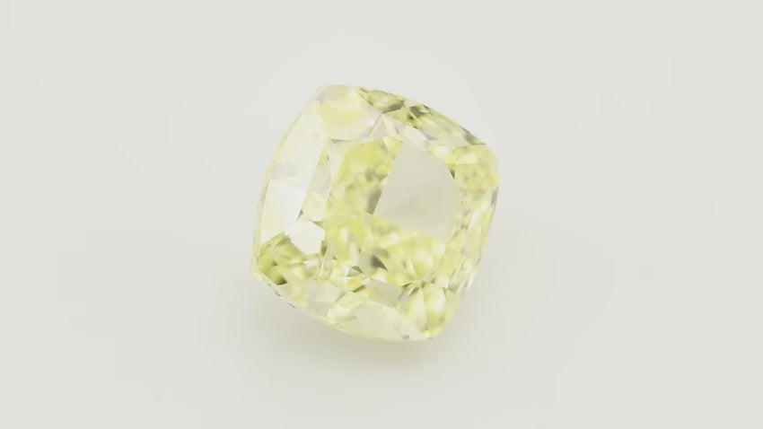 Un diamante di 1,50 carati, Fancy Yellow, taglio cuscino, con purezza VVS2, certificato GIA, caratterizzato da un'eccellente lucidatura e un'ottima simmetria per un fuoco e una brillantezza vibranti.