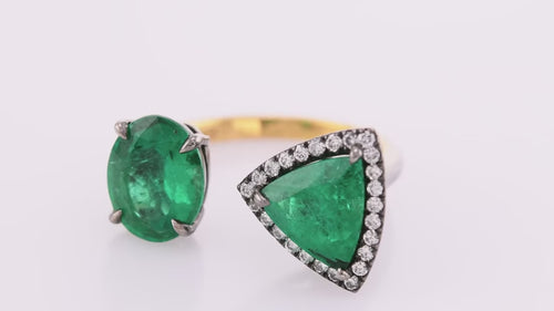 A lovely two-stone trilliant and oval emerald ring, with an oval gemstone weighing 1.74cts and a trilliant gemstone weighing 1.18cts. The emeralds are styled in a prong setting, with the trilliant emerald accented with collection color emeralds set in a closed pave halo. The ring is mounted in 18K Yellow gold.