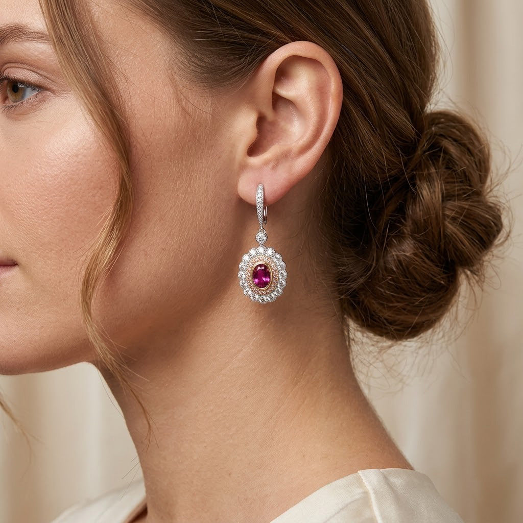Orecchini pendenti a goccia con rubino ovale e alone di diamanti rosa
