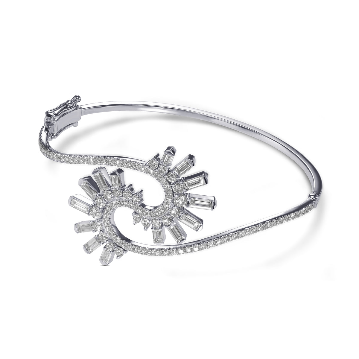 An extraordinary white diamond bangle, featuring collection color brilliants and baguettes styled in an abstract design and mounted in 18K white gold. The bangle has optional matching earrings and pendant.