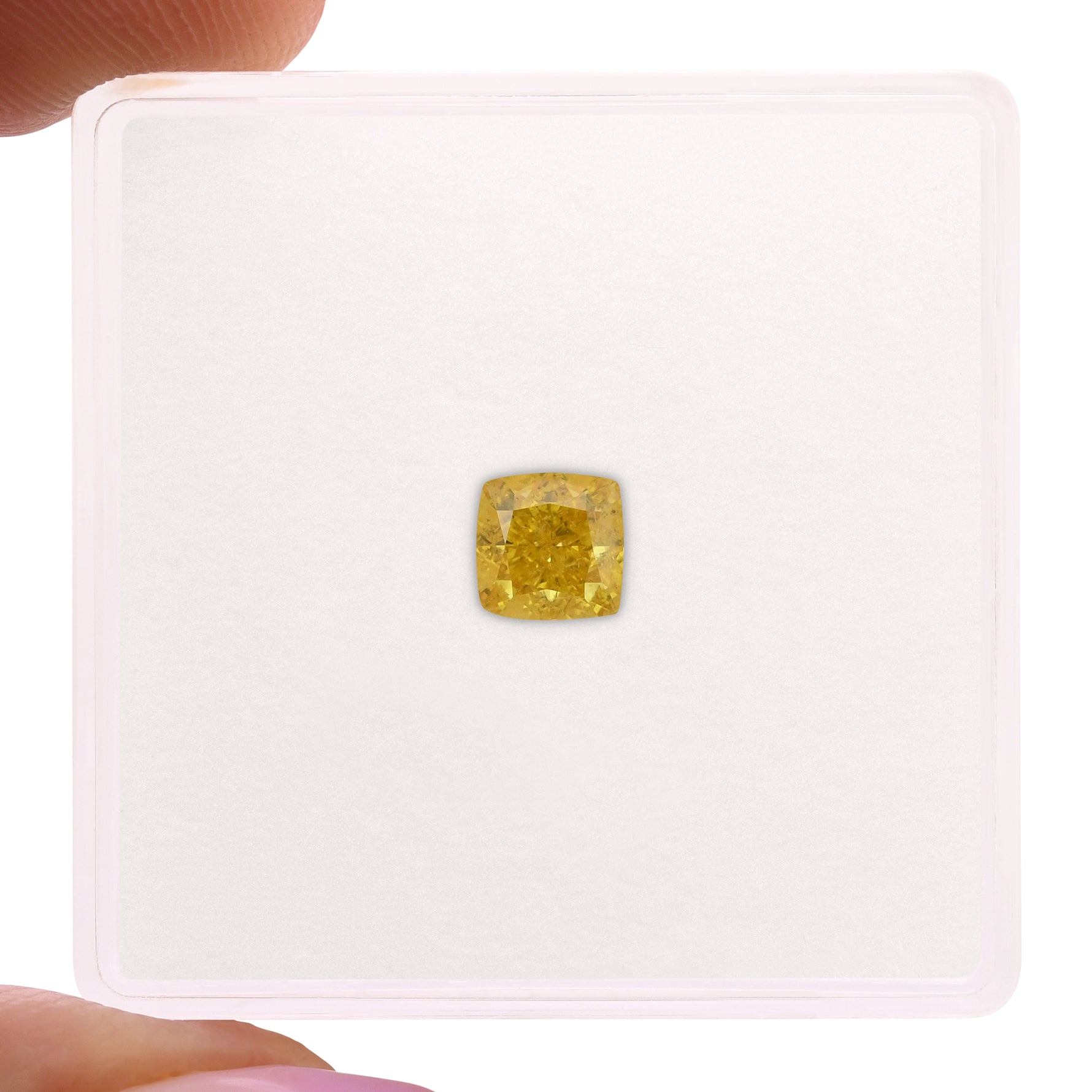 0.55 carat, Fancy Vivid Yellow, cushion diamond with SI2 clarity, graded by GIA. The stone has Excellent polish and Very Good symmetry