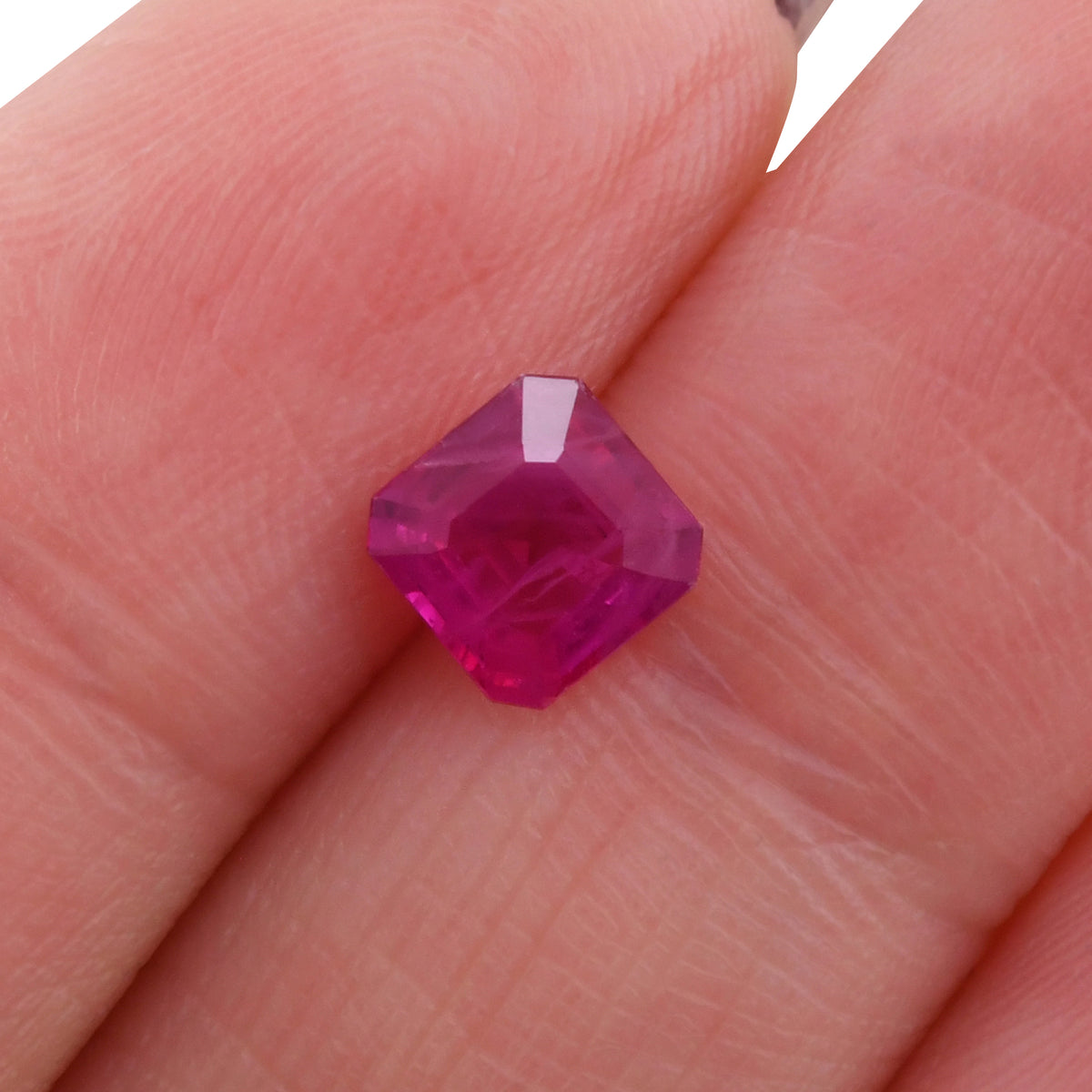 This striking 1.14 carat ruby showcases a vibrant red hue in a classic emerald cut. Sourced from Mozambique, this fine gemstone displays exceptional brilliance and vivacity, making it an excellent choice for discerning collectors and jewelry designers seeking a high-quality precious stone with remarkable color saturation and visual presence.