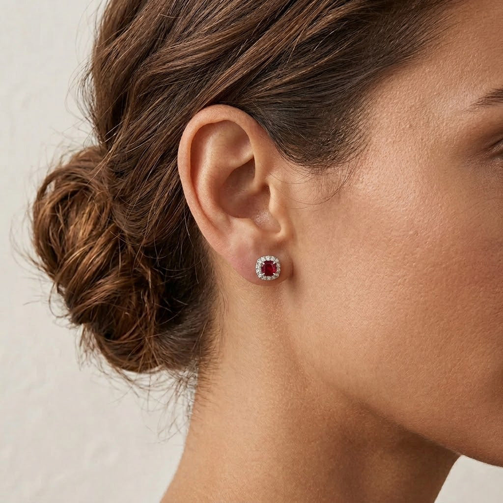 Cushion Ruby and Diamond Halo Earrings