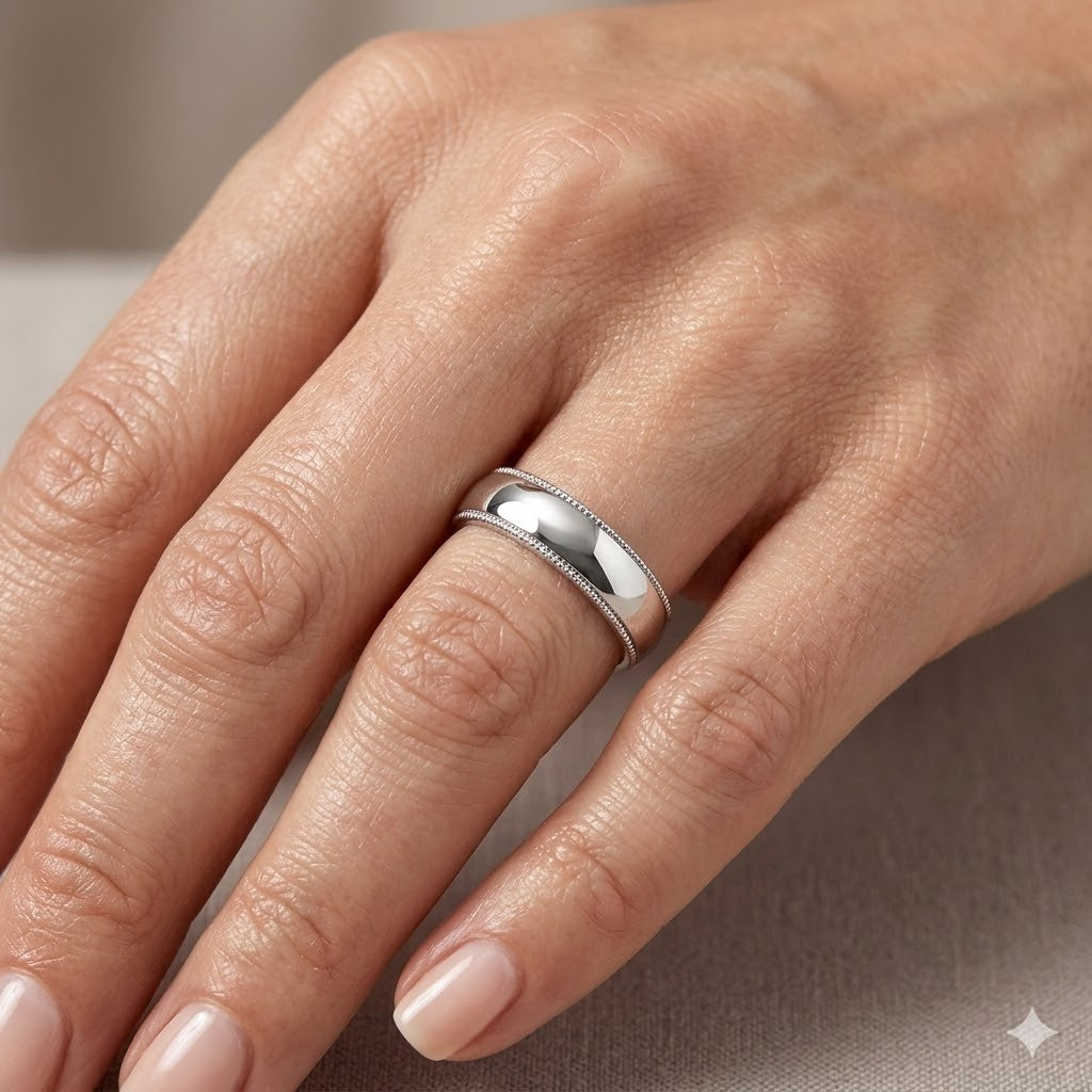 Anello a fascia in metallo semplice, con finitura milgrain, disponibile in oro o platino, larghezza 4MM.
