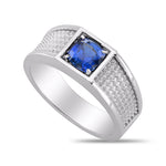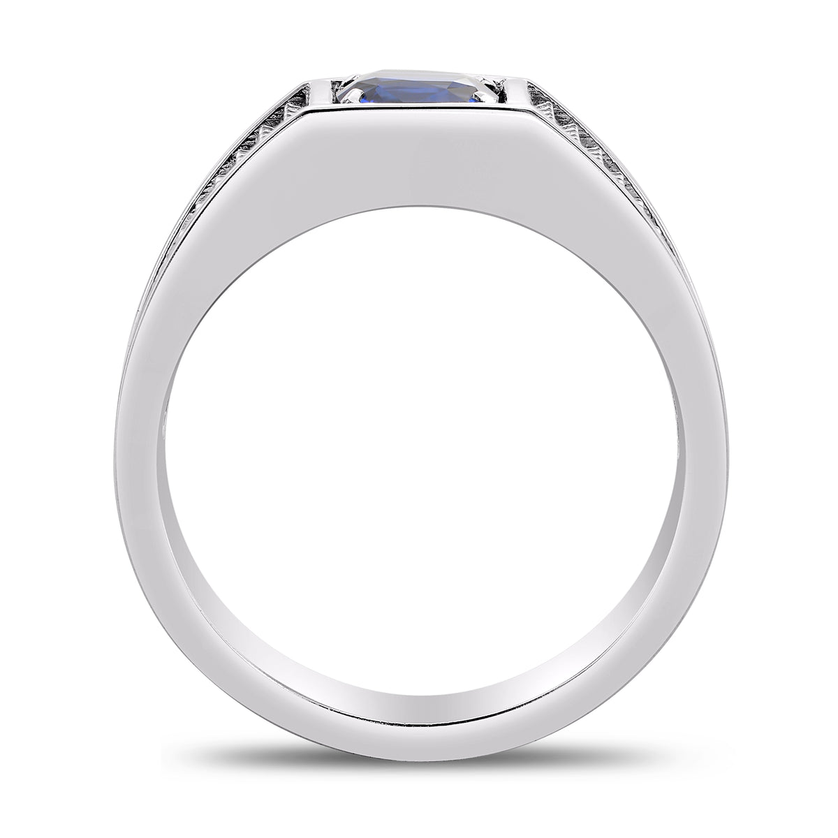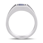 A stylish Blue Sapphire Men's ring styled in a prong setting and mounted in 18K White Gold. The band is enhanced with a textured finish, adding to the style of the ring.