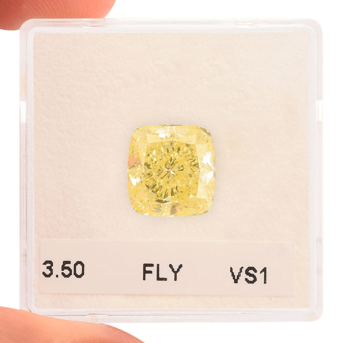 A commanding 3.50-carat Fancy Light Yellow cushion, GIA-certified with rare Double Excellent polish and symmetry. This VS1 masterpiece offers a substantial "face-up" presence and a refined, sun-kissed brilliance.