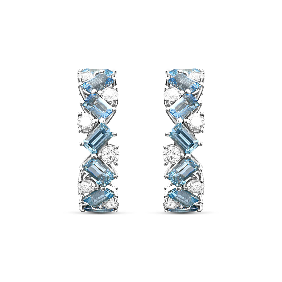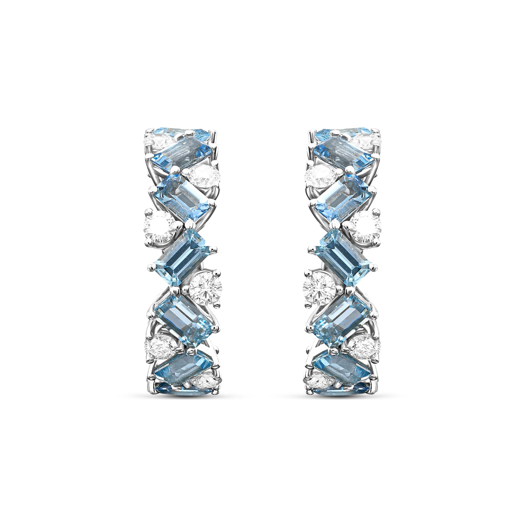 A fabulous pair of aquamarine and diamond earrings, with emerald shape aquamarines and white diamond brilliants styled in an alternating zigzag motif, and mounted in 18K white gold. The earrings have the option to be purchased as part of a matching set of ring and pendant.