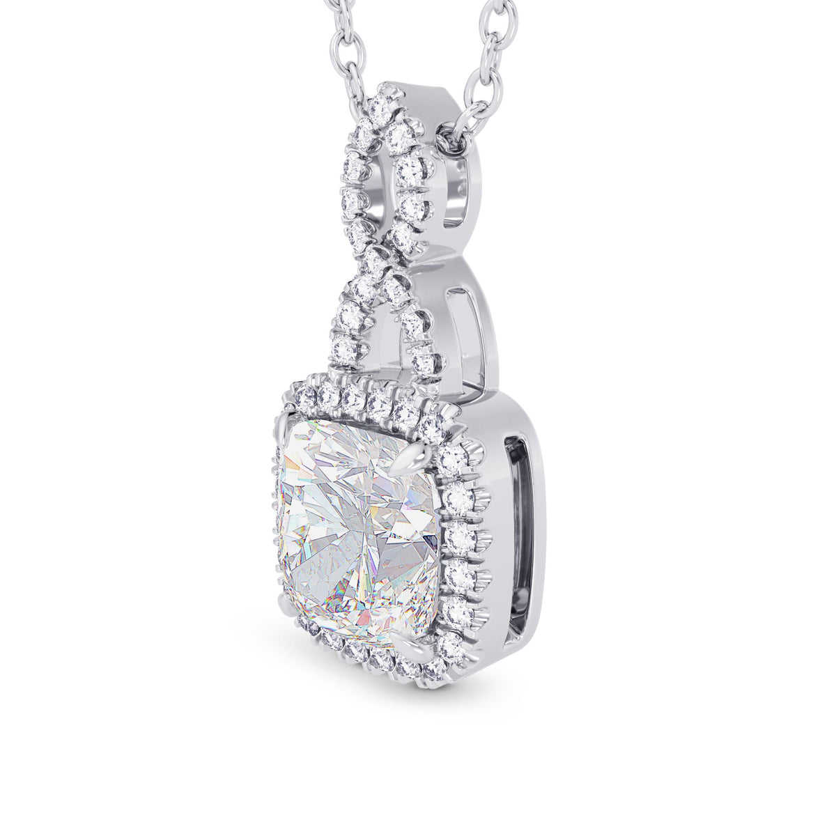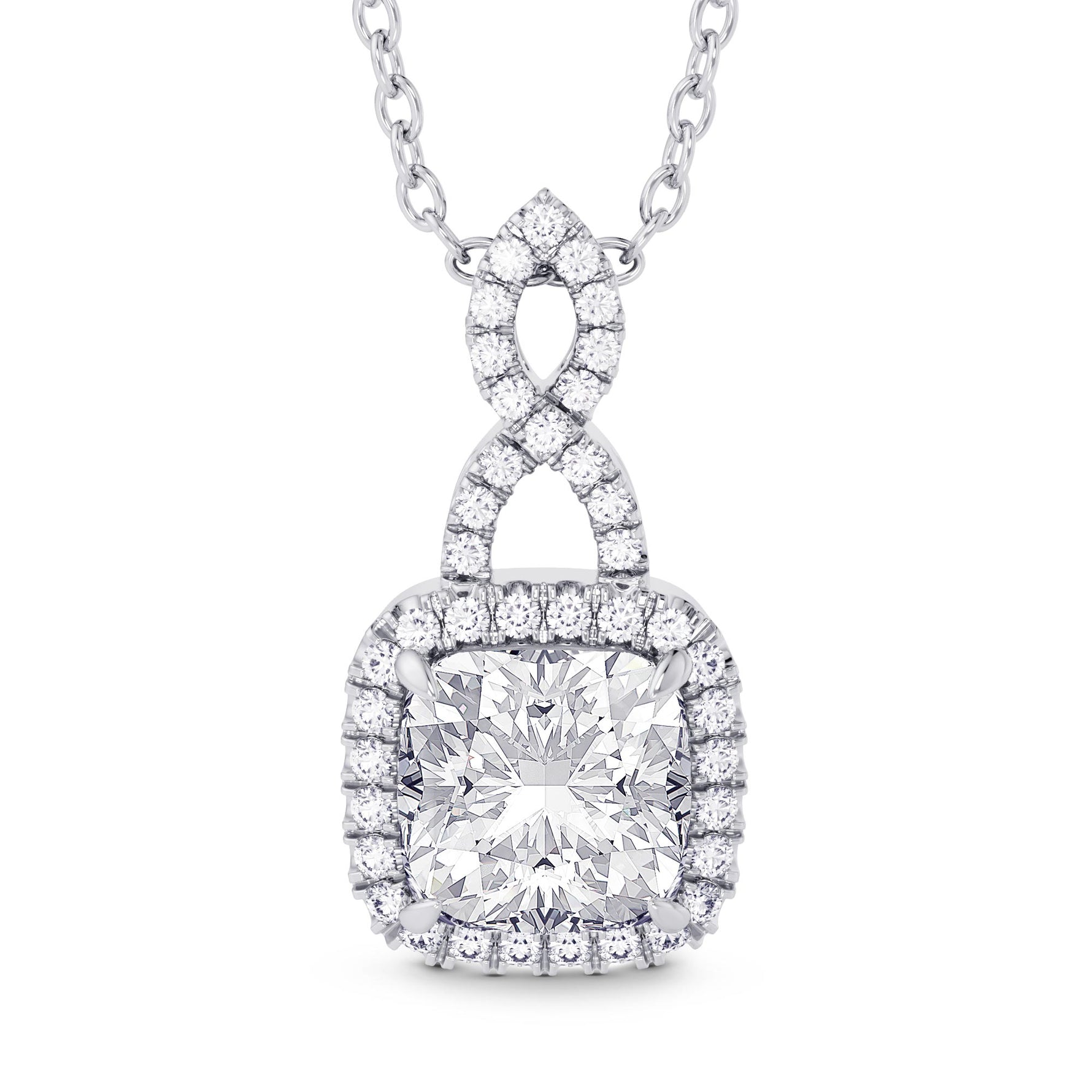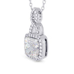 A 1.50ct GIA Cushion Diamond Halo & Drop Pendant styled in an Open Pave Halo and Bail setting. Available in 18K White gold or Platinum.