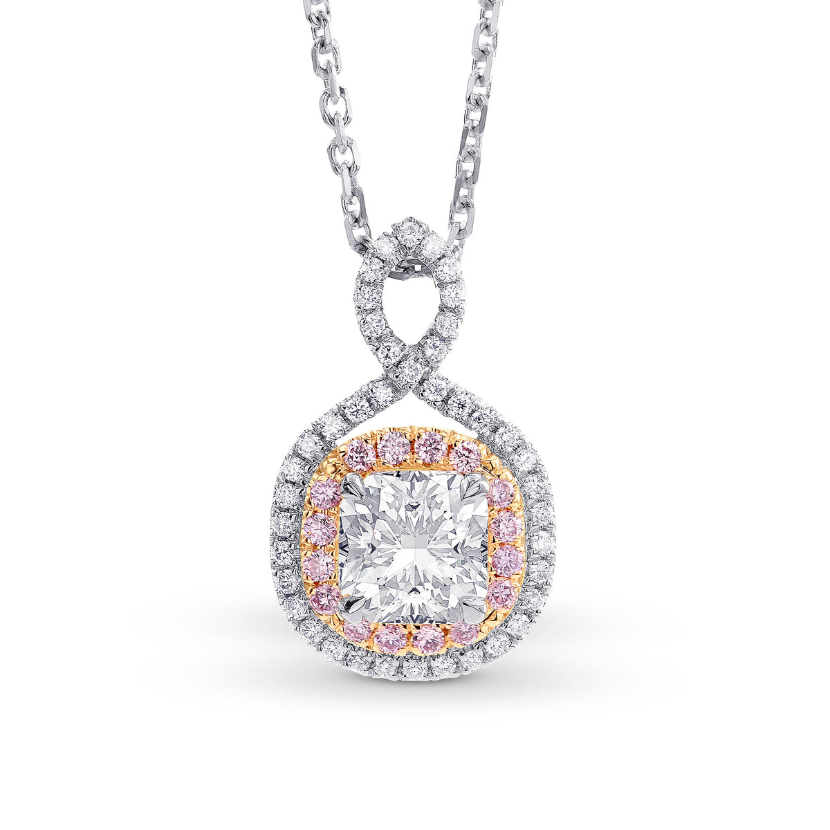 This elegant pendant showcases a 0.70ct cushion-cut colorless diamond as its centerpiece, framed by a sophisticated double halo design. Fancy pink round brilliants encircle the inner halo, while colorless round brilliants form the outer halo, with both halos intersecting gracefully at the bail. Crafted in your choice of platinum or 18k gold, this piece combines refined geometry with exceptional gemstone quality for a timeless statement.