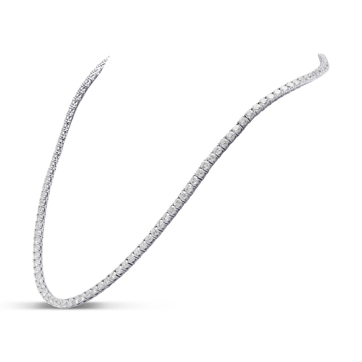 A classic white diamond tennis necklace, with 20cts collection color brilliants styled in a 4 prong setting and mounted in 14K white gold.