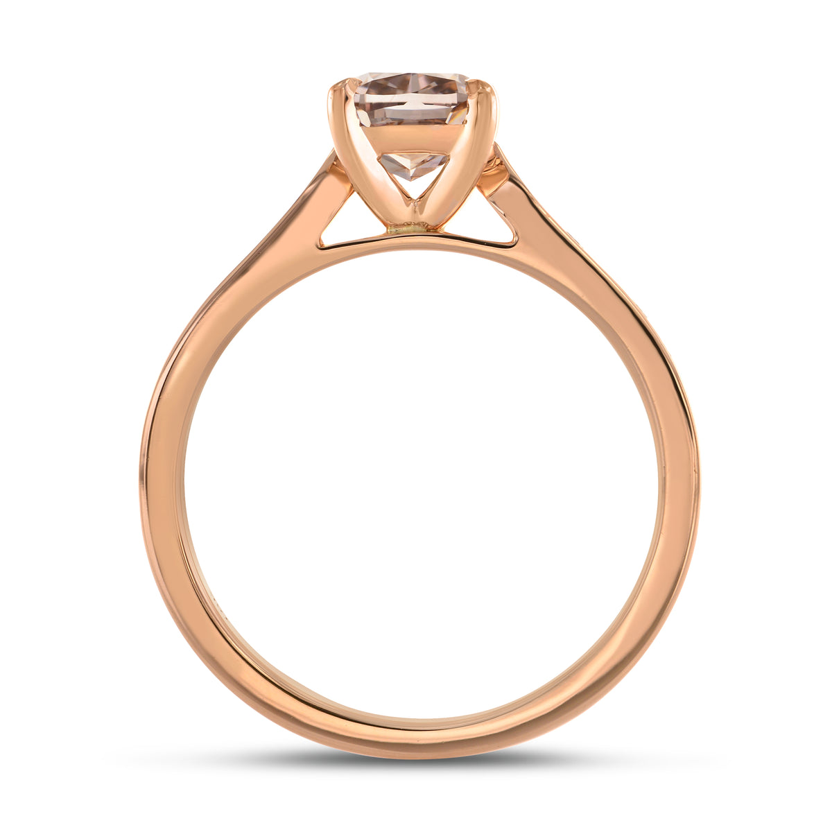 A lovely fancy brown cushion and pave side-stone ring, with a center stone weighing 1.32cts and certified by GIA. The diamond is accented by collection color brilliant side-stones styled in a closed pave accenting the shank, and the ring is mounted in 18K rose gold.