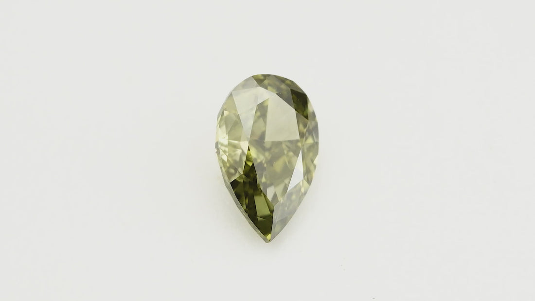 0.51 carat, Fancy Dark Gray Yellowish Green, pear shape diamond with VS1 clarity, graded by GIA. A magnificent green diamond that's full of luster. The stone has Good polish and Very Good symmetry. Chameleon diamonds briefly change color when heated or left in the dark.