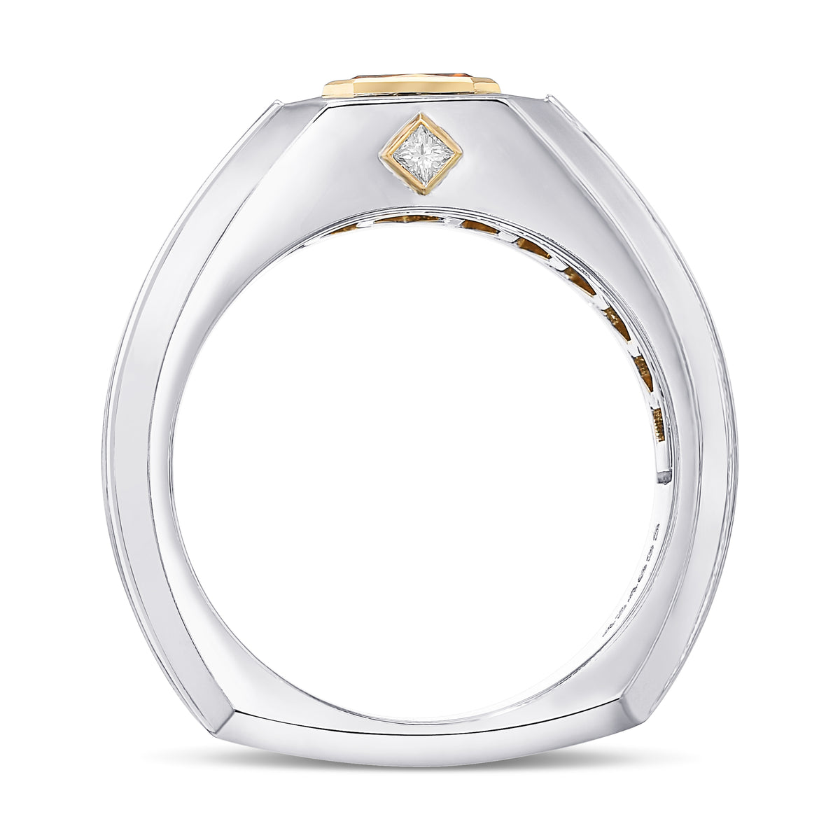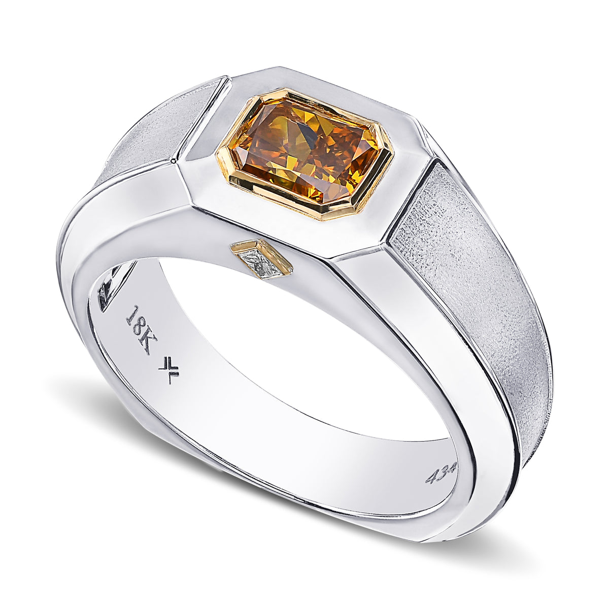 Presenting a stylish Men's ring showcasing a radiant shape diamond with a remarkable 1.11cts fancy deep brownish yellowish orange hue, GIA certified for quality. The diamond is elegantly set in a secure bezel setting, and the band features a textured finish, enhancing the ring's distinct style. Mounted in a combination of 18K white and yellow gold, this ring is a unique and fashionable statement piece for the modern man.
