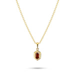 A gorgeous fancy deep yellowish orange hexagonal diamond pendant with a center diamond weighing 0.26cts and certified by GIA. The diamond is styled in a double bezel halo setting, and is mounted in 18K yellow gold.