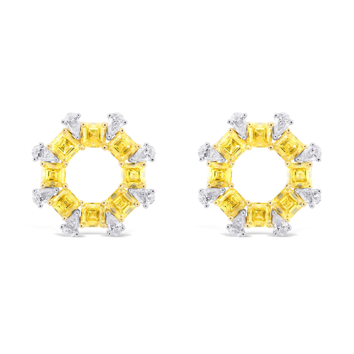 Fancy Intense Yellow Asscher and Pear Diamond Earrings.