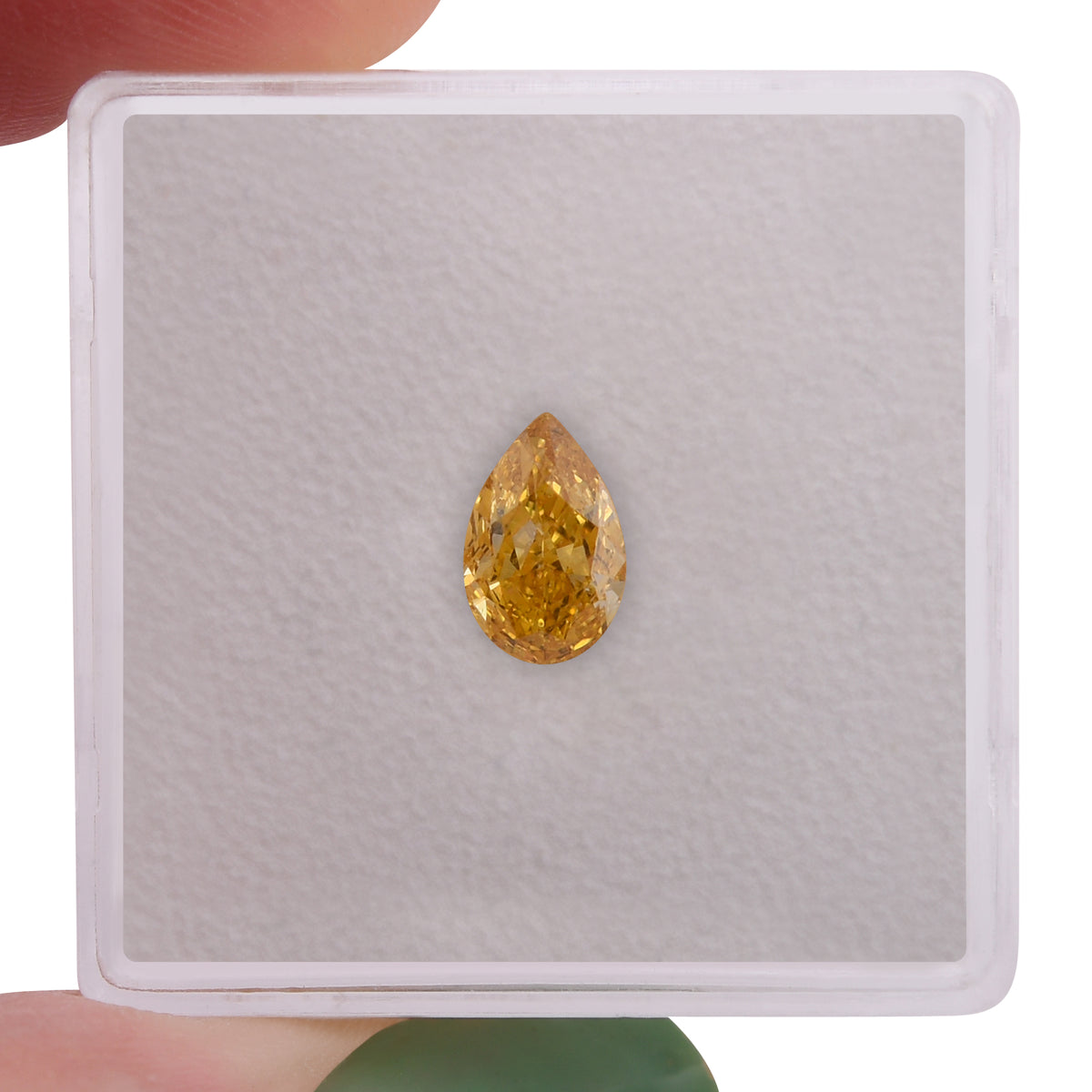 This 0.70 carat Fancy Vivid Orange Yellow pear-shaped diamond boasts exceptional brilliance and a rare, vibrant hue. Graded VS2 by GIA for clarity, it offers remarkable sparkle with minimal inclusions.