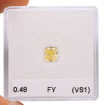 0.48 carat, Fancy Yellow, Cushion shape Diamond with VS1 clarity. A fine yellow diamond with a lively luster. Color and clarity graded by our in house GIA GG Graduate Gemologist.