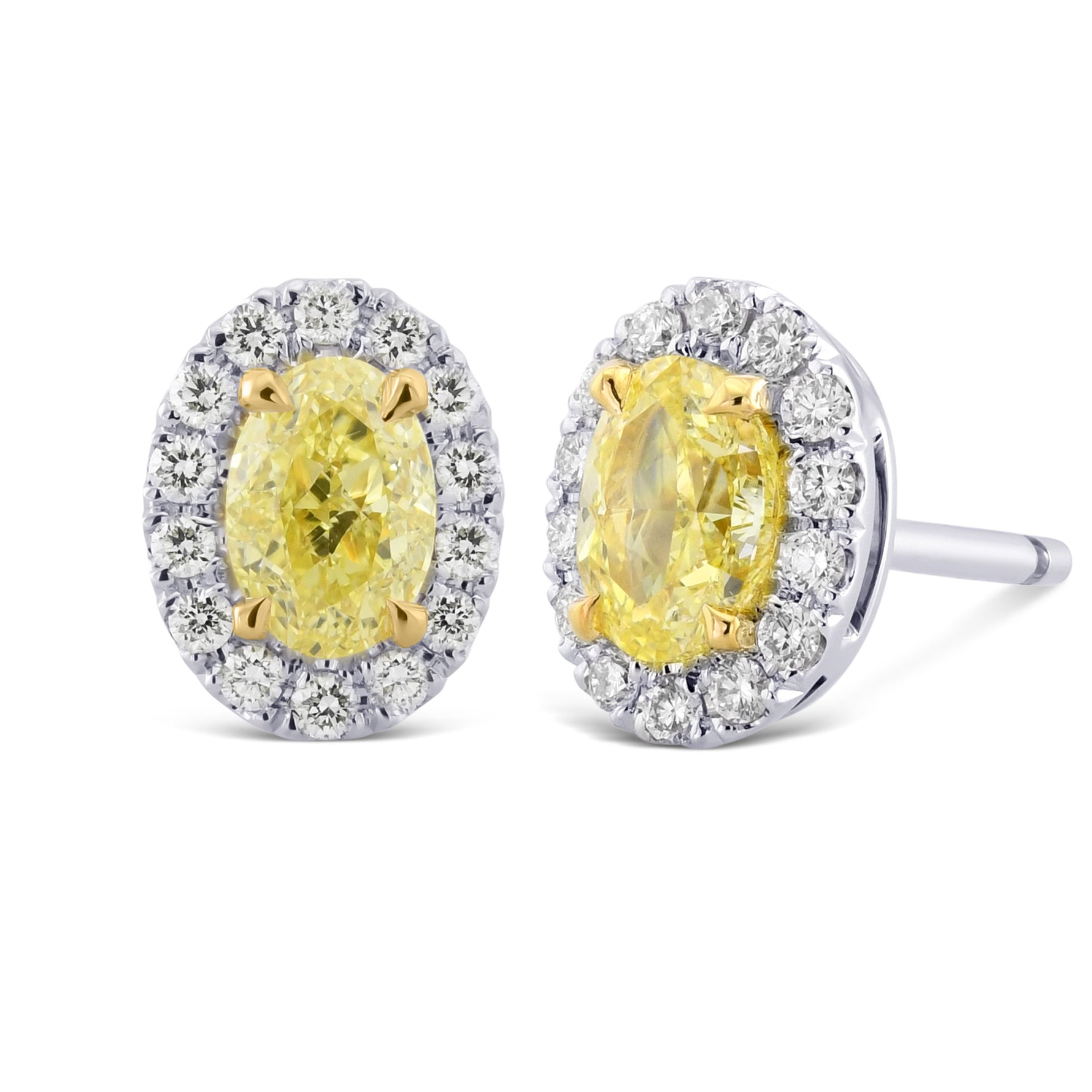 A classic pair of fancy yellow oval diamond halo earrings, featuring a perfect pair of diamonds weighing 1.00cts total weight and certified by GIA. The diamonds are accented by collection color side stones styled in an open pave halo and mounted in 18K white and yellow gold.