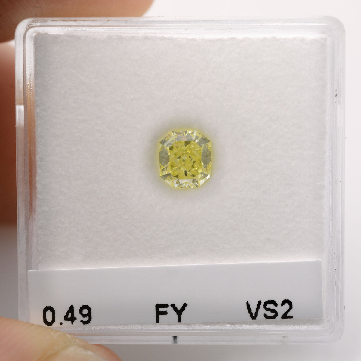 0.49 carat, Fancy Yellow, Radiant shape Diamond with VS2 clarity, graded by GIA. A delightful Yellow Diamond with a good color saturation and sparkle.The stone has Very Good polish and Good symmetry.