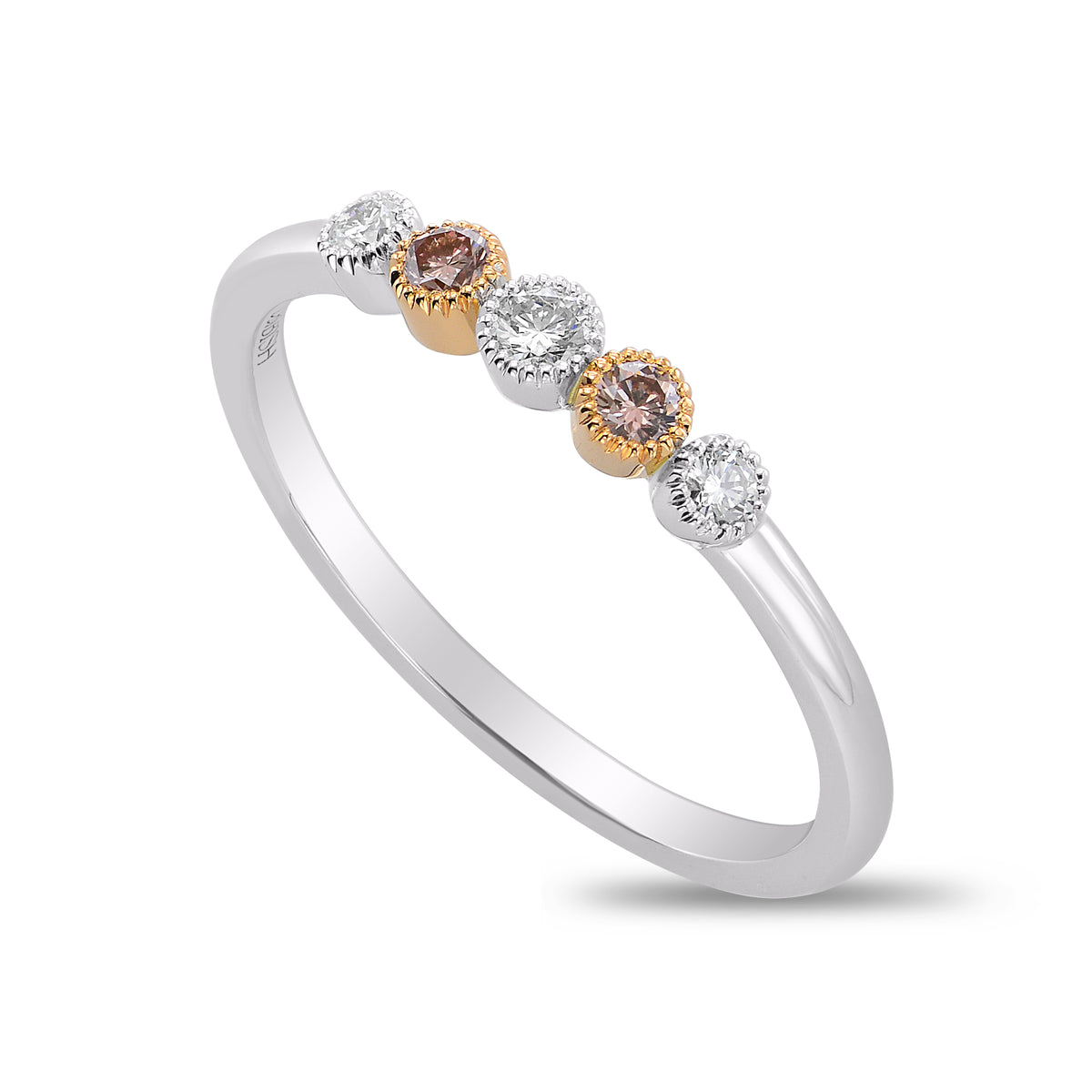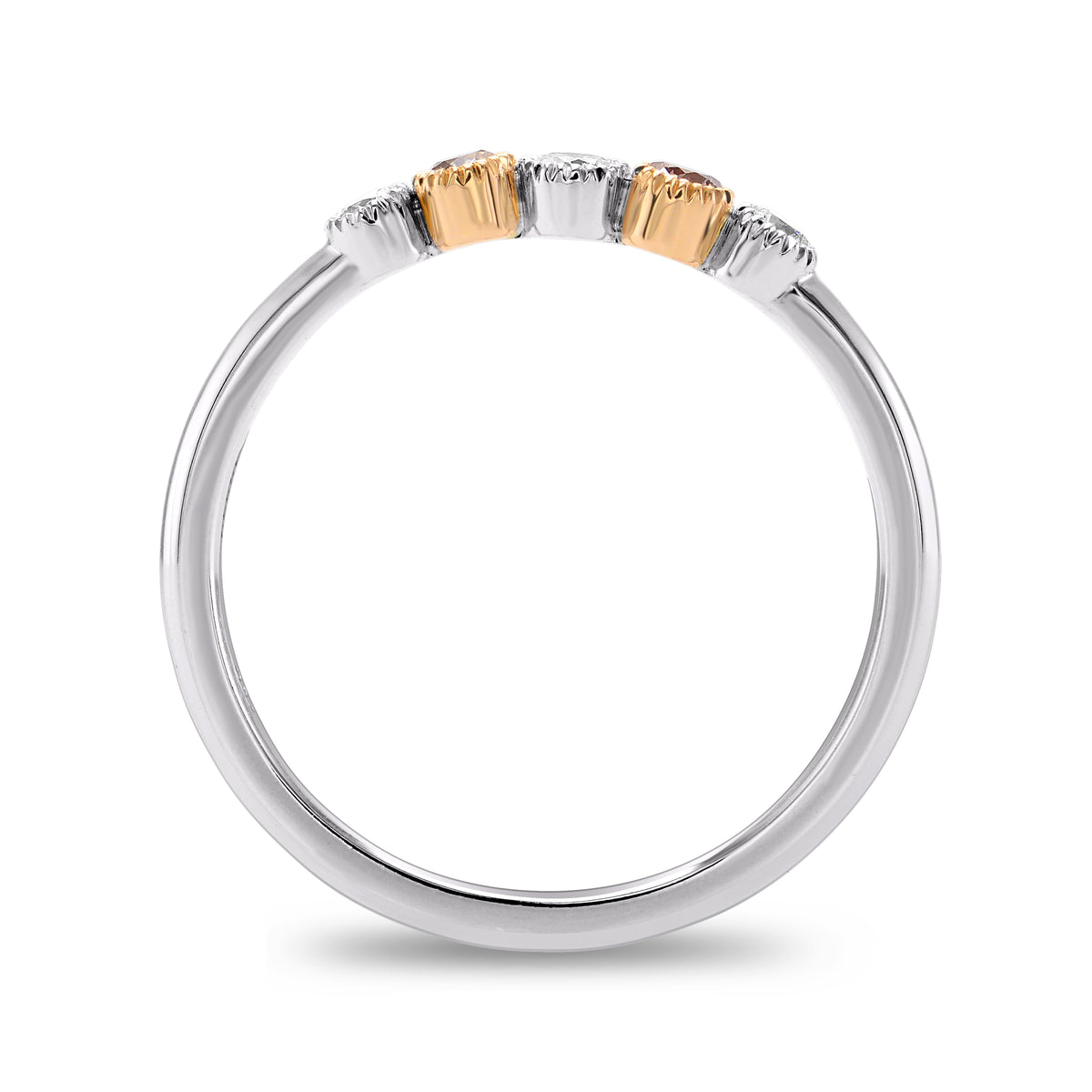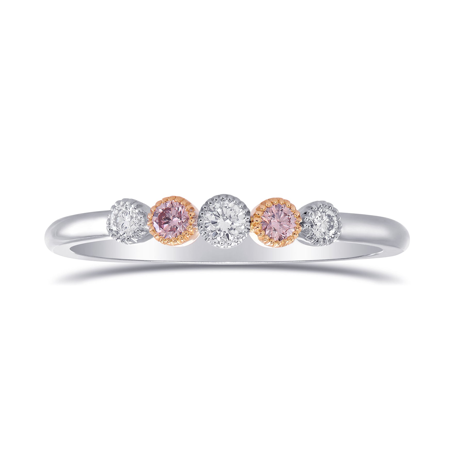 Vintage style five stone band ring, with alternating fancy light pink diamonds, featuring a bezel style setting with a milgrain�edge. Mounted in 18K white and rose gold.