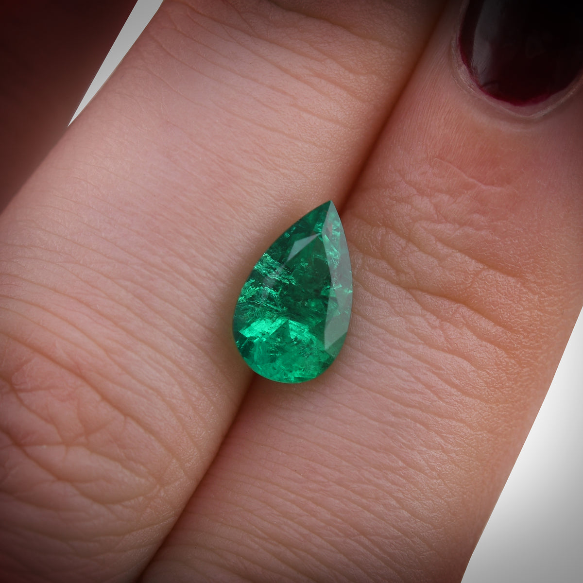 A stunning 1.65-carat Colombian emerald in a classic pear cut, showcasing the rich, vibrant green hue that defines premium Colombian stones. CD certified for authenticity and quality. This exceptional gemstone combines substantial size with the elegant proportions of the pear shape, making it an ideal centerpiece for fine jewelry.