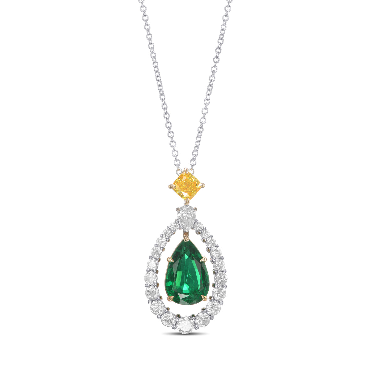 Green Emerald and Fancy Vivid Yellow Diamond Halo Pendant