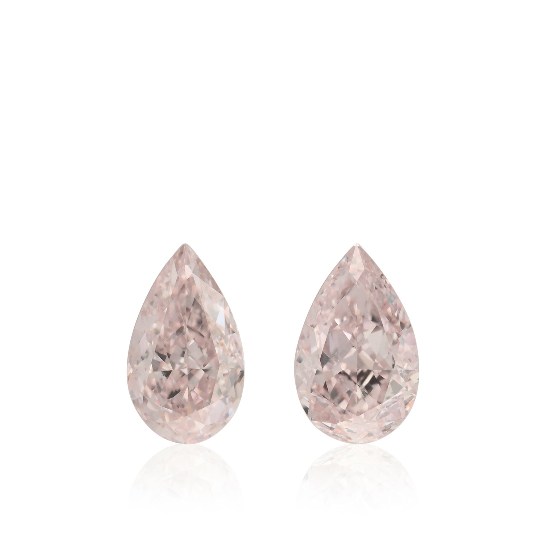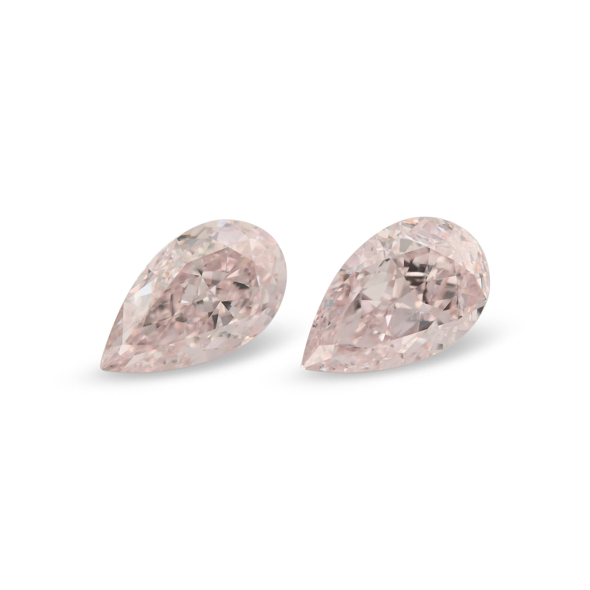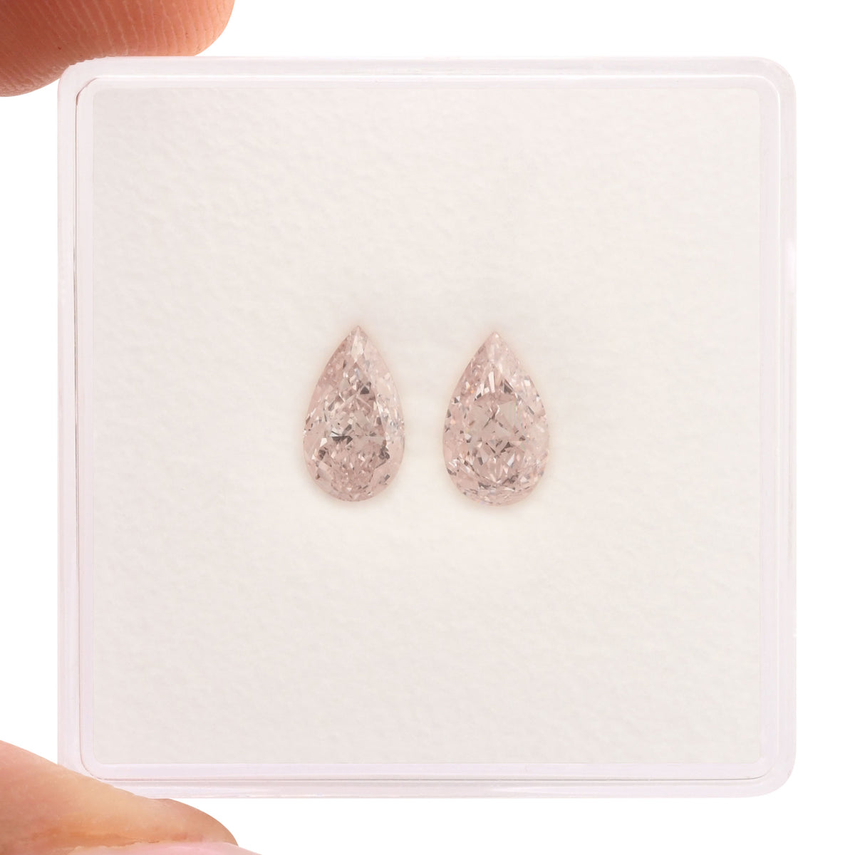 A matched pair of exquisite light pink pear-shaped diamonds, total weight 1.06cts carats with VS1 clarity and GIA certification. These rose-hued stones showcase the delicate warmth and rarity of natural fancy light pink diamonds, ideal for creating a distinctive two-stone engagement ring or sophisticated paired earrings.
