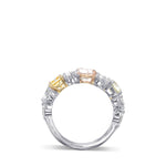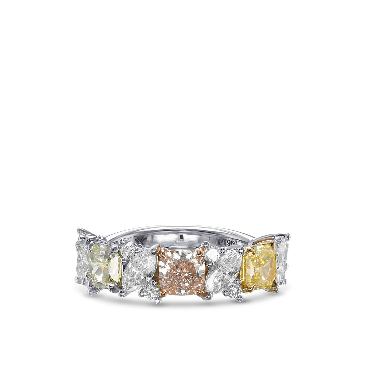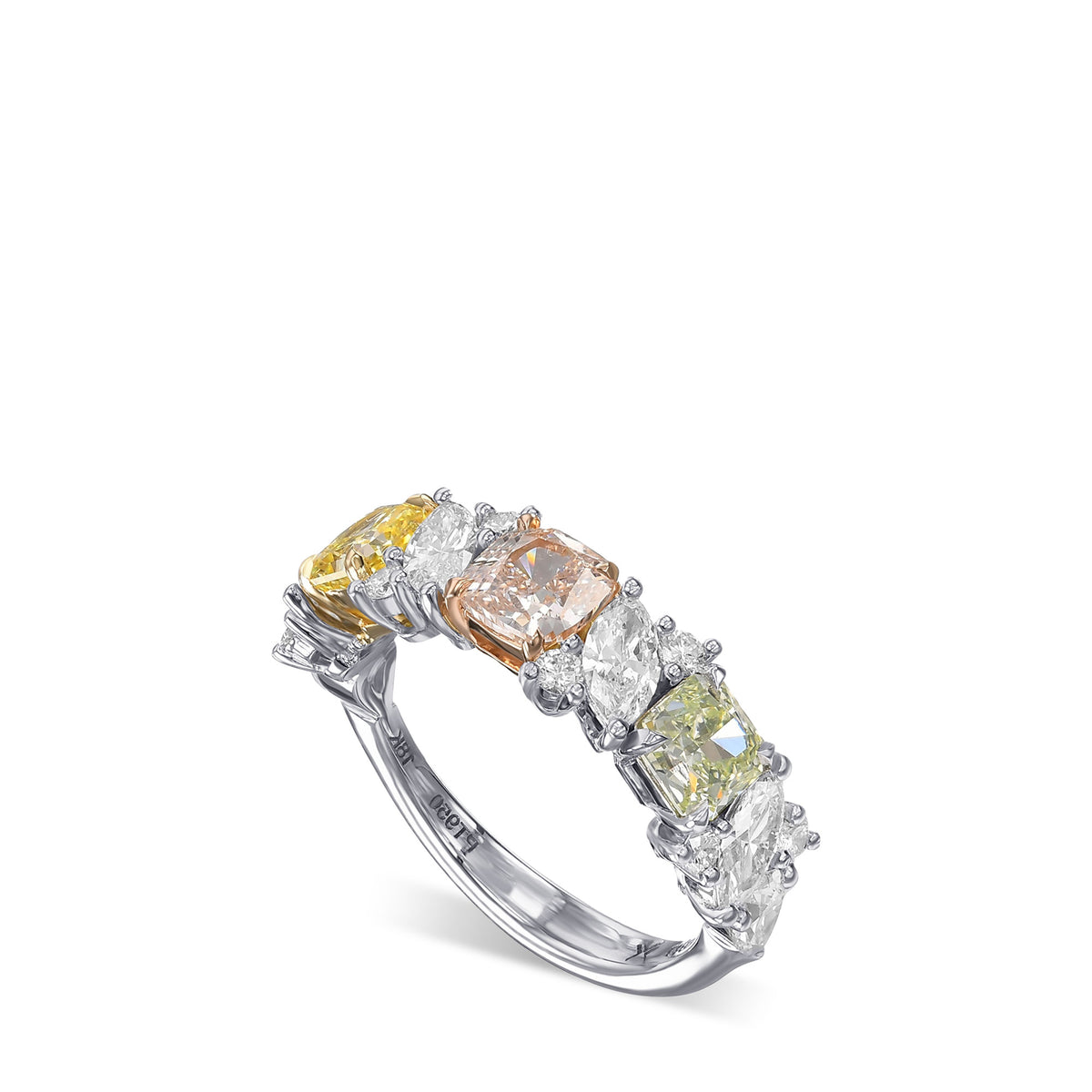 Inspired by nature, this beautiful ring features yellow, green and brown radiant and cushion shape diamonds, styled in an asymmetrical design and certified by GIA. These diamonds are accented by collection color pears marquise and brilliants, all styled in prongs, and the ring is mounted in platinum and 18K yellow and rose gold.