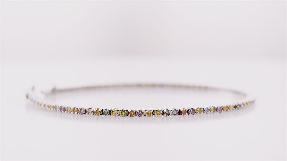This exquisite tennis bracelet features 2.39 carats of multi-color round brilliant diamonds, showcasing a captivating blend of mix color hues. Expertly set in 18K white gold, it offers a stunning contrast that enhances each diamond's unique sparkle.