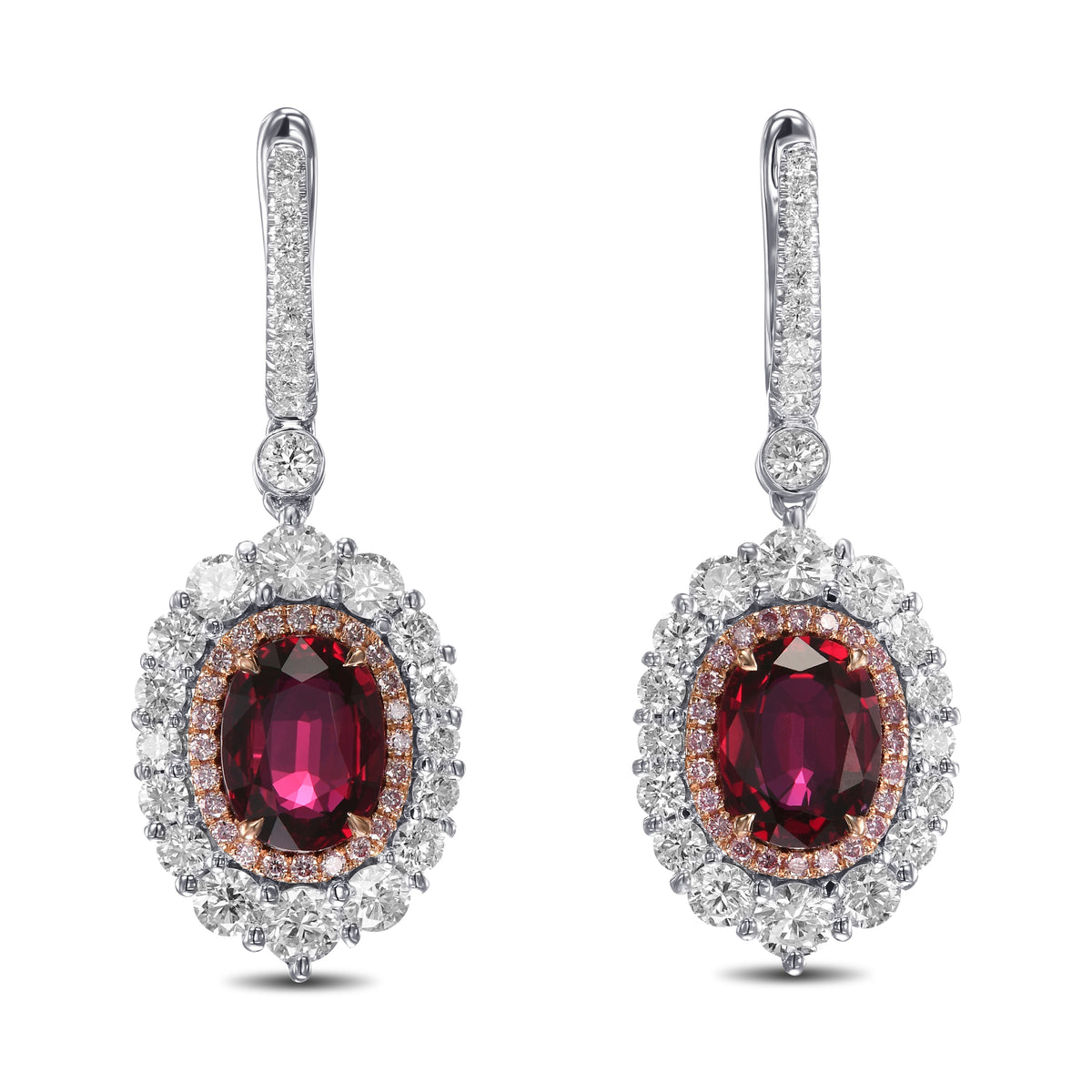 A beautiful oval Mozambique ruby, fancy pink and colorless round brilliant diamond double halo earrings. Mounted in 18K white and rose gold. These earrings are part of the Rosie's Bloom Collection.