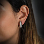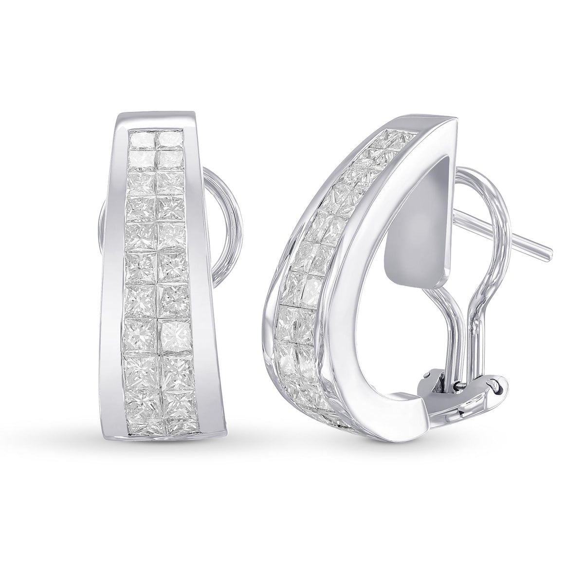 A beautiful pair of white diamond princess cut hoop earrings, with collection color diamonds set in a Channel setting and mounted in 14K white gold. Color and clarity graded by our in house GIA GG Graduate Gemologist.