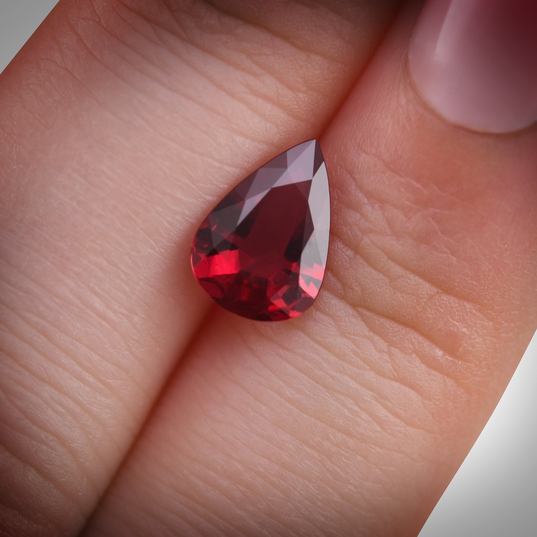 This 1.72 carat pear-shaped ruby from Mozambique dazzles with a vivid red hue and excellent transparency. Graded by CD, it shows subtle signs of heat treatment that enhance its natural beauty. Perfect for a striking, elegant jewelry piece that captures attention.