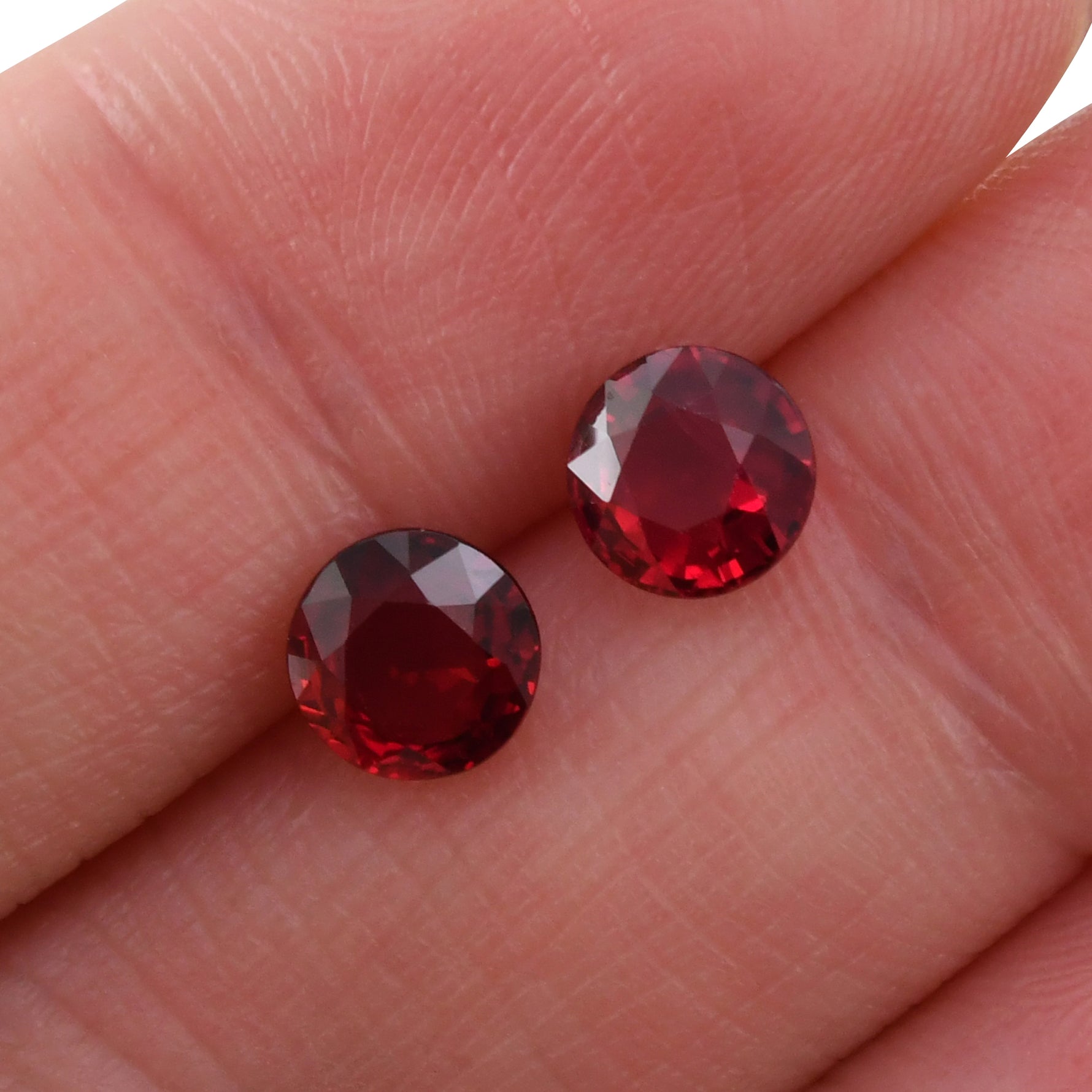 A lovely pair of red, round shape Ruby gemstones, total weight 2.12cts. The stones face-up beautifully and can be purchased as a loose pair or set as a pair of earrings in a Leibish setting style or custom design.