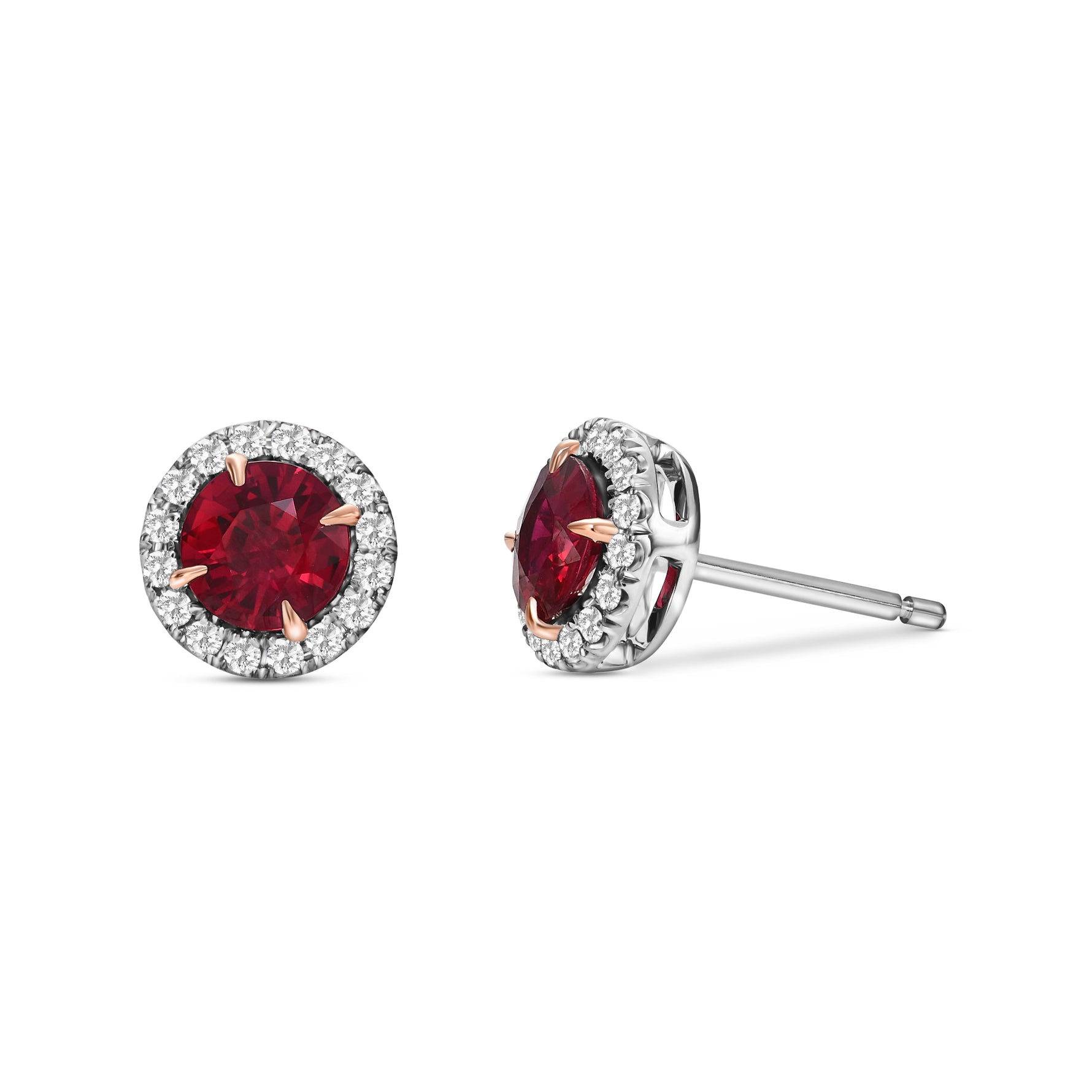 A classic pair of round red ruby and diamond halo earrings, with a pair of gemstones weighing 1.71cts. Mounted in 18K white and rose gold, these exquisite earrings feature collection color brilliants styled in an open pave halo. These earrings are part of the Zia collection.
