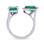 A lovely two-stone trilliant and oval emerald ring, with an oval gemstone weighing 1.74cts and a trilliant gemstone weighing 1.18cts. The emeralds are styled in a prong setting, with the trilliant emerald accented with collection color emeralds set in a closed pave halo. The ring is mounted in 18K Yellow gold.